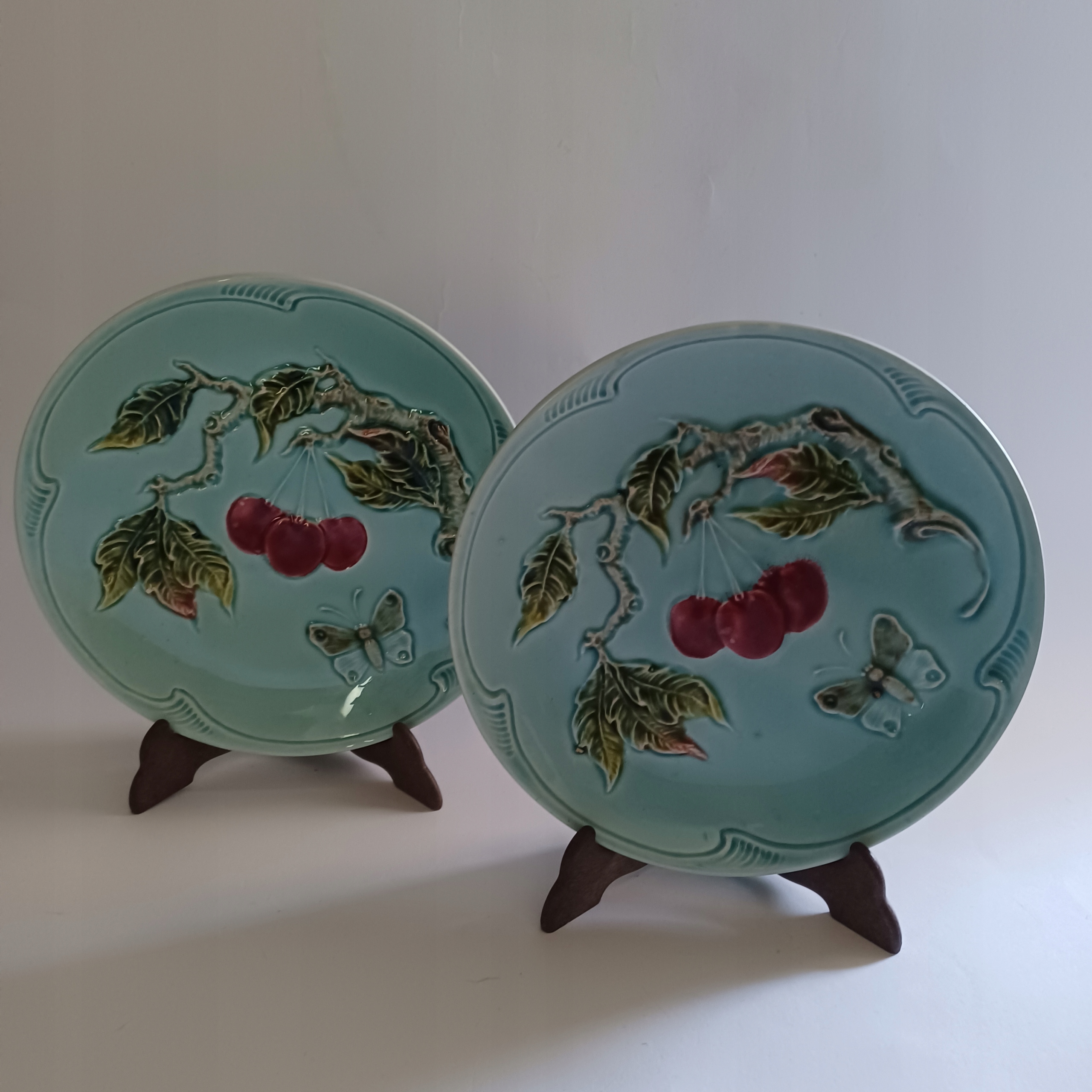 Дві чудові майолікові тарілки - чудова німецька компанія з 200-річною традицією, майолікові тарілки в красивій білій бірюзі з декором: витончена гілка з соковитою вишнею та тисненням 2126 з літерою ,, Z,, Діаметр 17 см. Дуже хороший стан