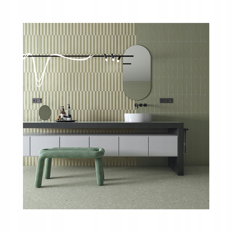 плитки Zellige, такі як Vives Salou AB | C Esmeralda, характеризується унікальною, ніби обробка ручної роботи. Вони нерівні, і їх відтінки можуть відрізнятися один від одного. Їх матова поверхня та інтенсивний зелений колір можуть прекрасно оживити простір у ванній кімнаті, надаючи йому елегантний і в той же час природного характеру.