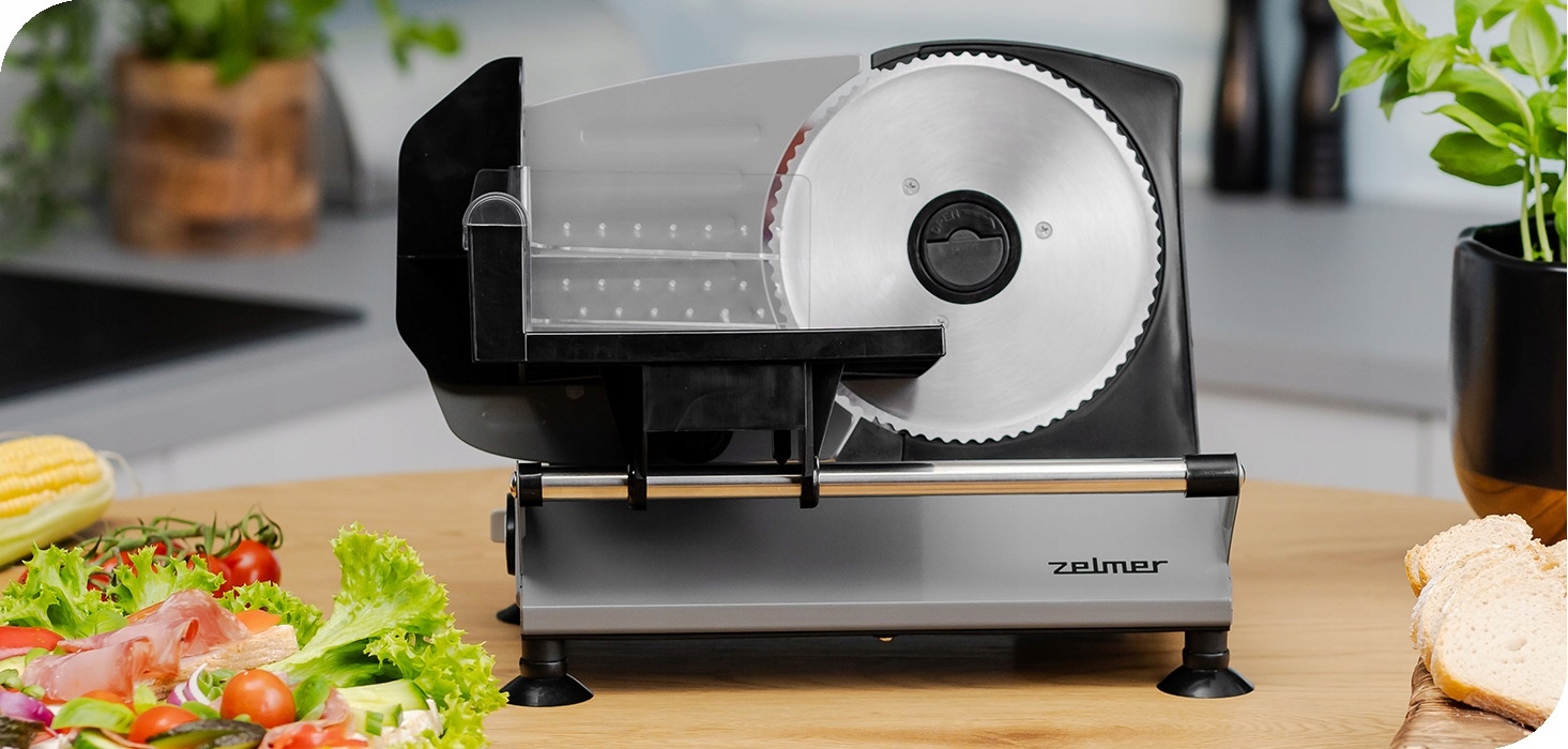 Лезо потребує догляду, і ми дбаємо про вашу безпеку. Слайсер Zelmer оснащений фіксатором для запобігання випадкового включення. Щоб запустити його, потрібно утримувати спеціальну кнопку. Безпека перш за все!