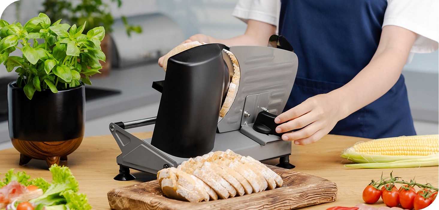 Слайсер потужністю до 150 Вт — це гарантія швидкості та точності в одному. Його ефективний двигун гарантує, що кожен виріб можна легко розрізати, незалежно від його твердості.