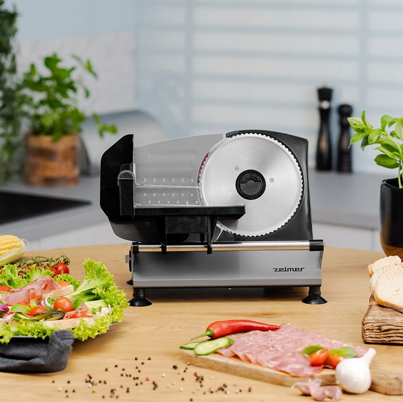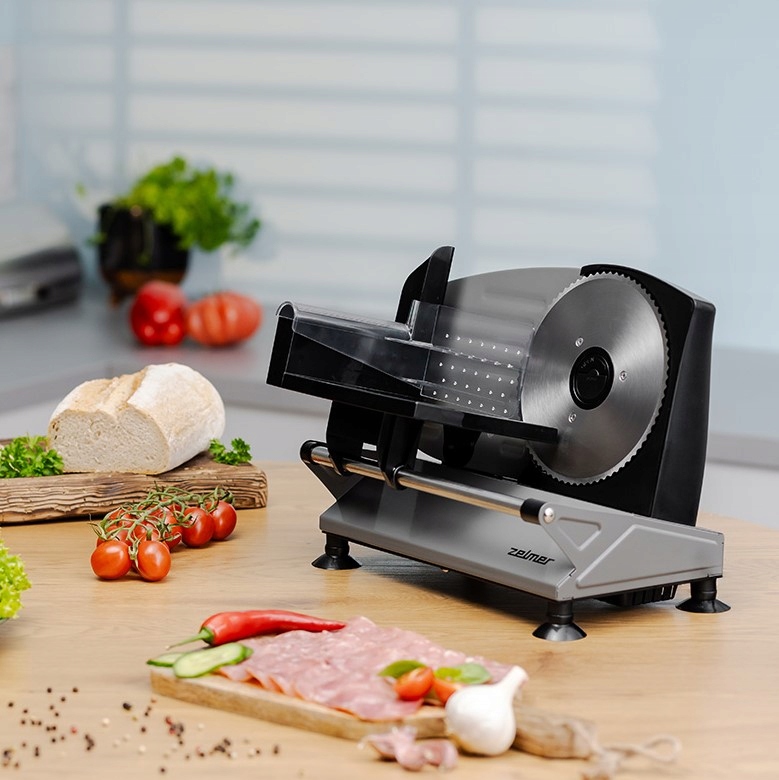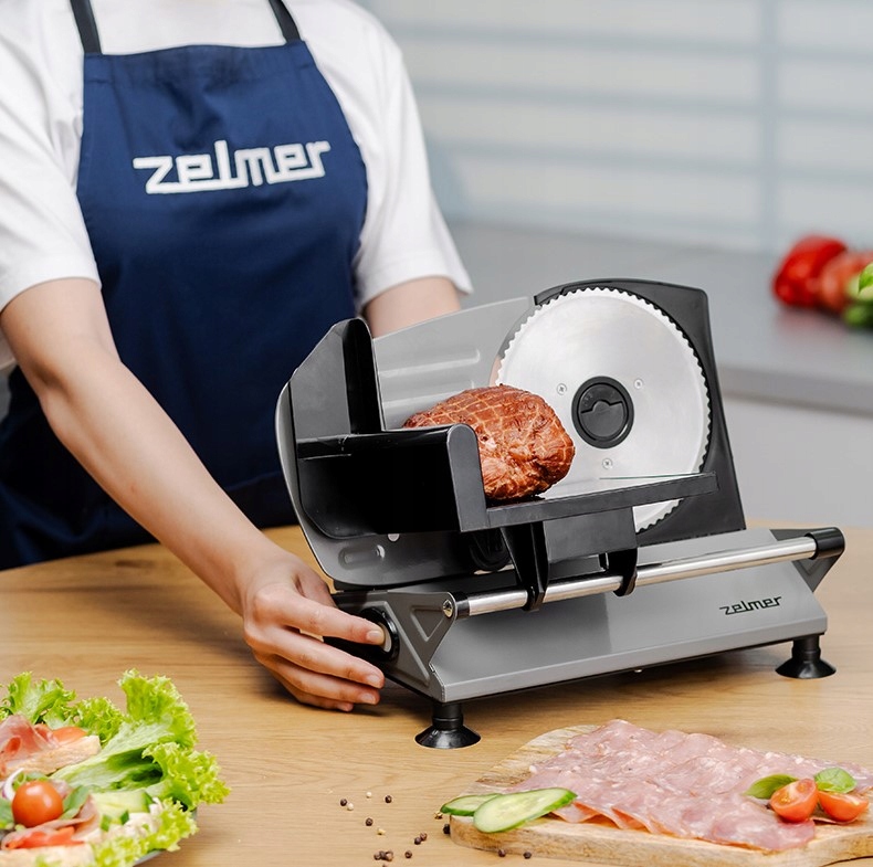 Zelmer ZFS0919 потужністю 150 Вт з плавним регулюванням товщини нарізки від 0 до 15 мм. Оснащений зубчастим лезом з нержавіючої сталі та запобіжником. Завдяки своїй розкладній конструкції та відсіку для шнура він займає мало місця на кухні.