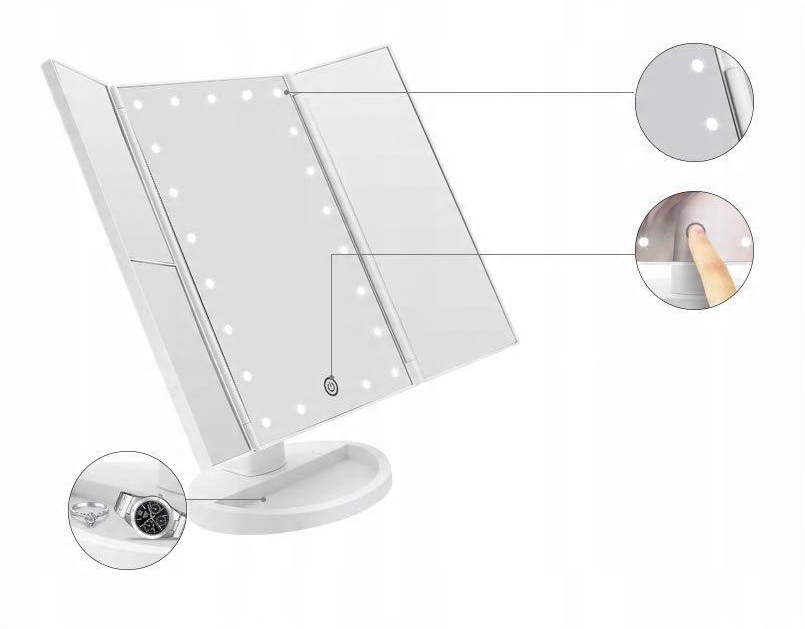 Виготовлене з високоякісних матеріалів дзеркало має 2 бокових дзеркала. Ліве крило має подвійне та потрійне збільшувальні дзеркала. Завдяки можливості регулювати кут нахилу дзеркала до 180°, ви можете легко налаштувати його положення відповідно до своїх потреб і вподобань.