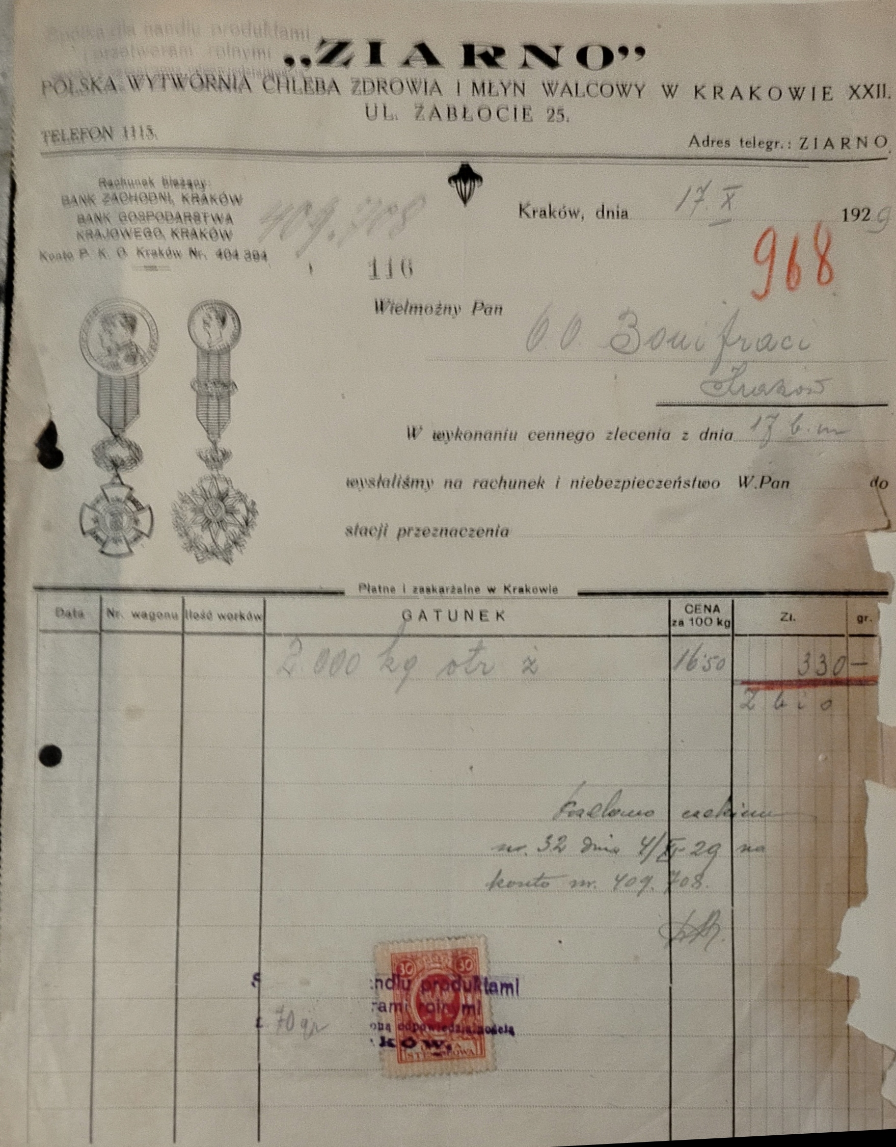 ЗЕРНО - KRAKÓW XXII - PODGÓRZE - РАХУНОК - 1929