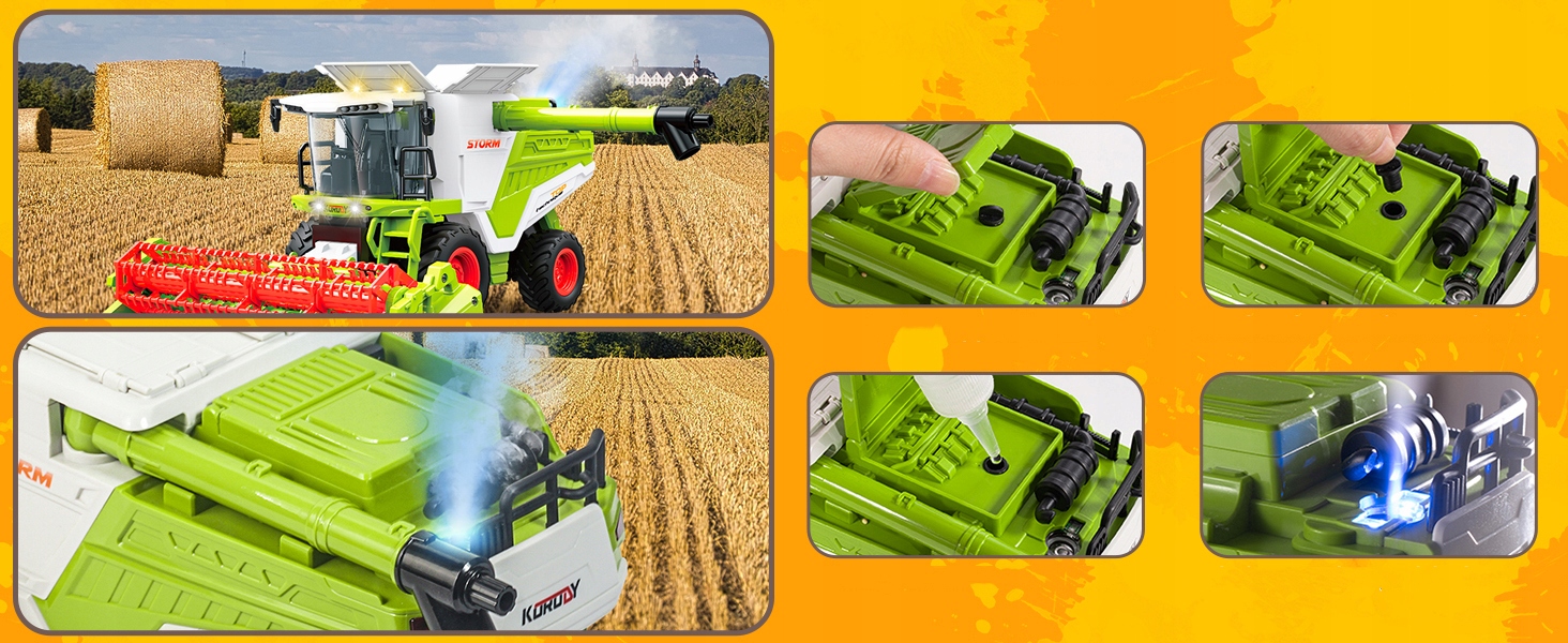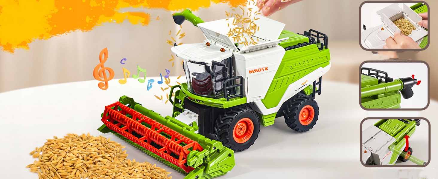 - Зернозбиральний комбайн із дистанційним керуванням, звуком, світлом та розпилювачем, акумулятором великої ємності.