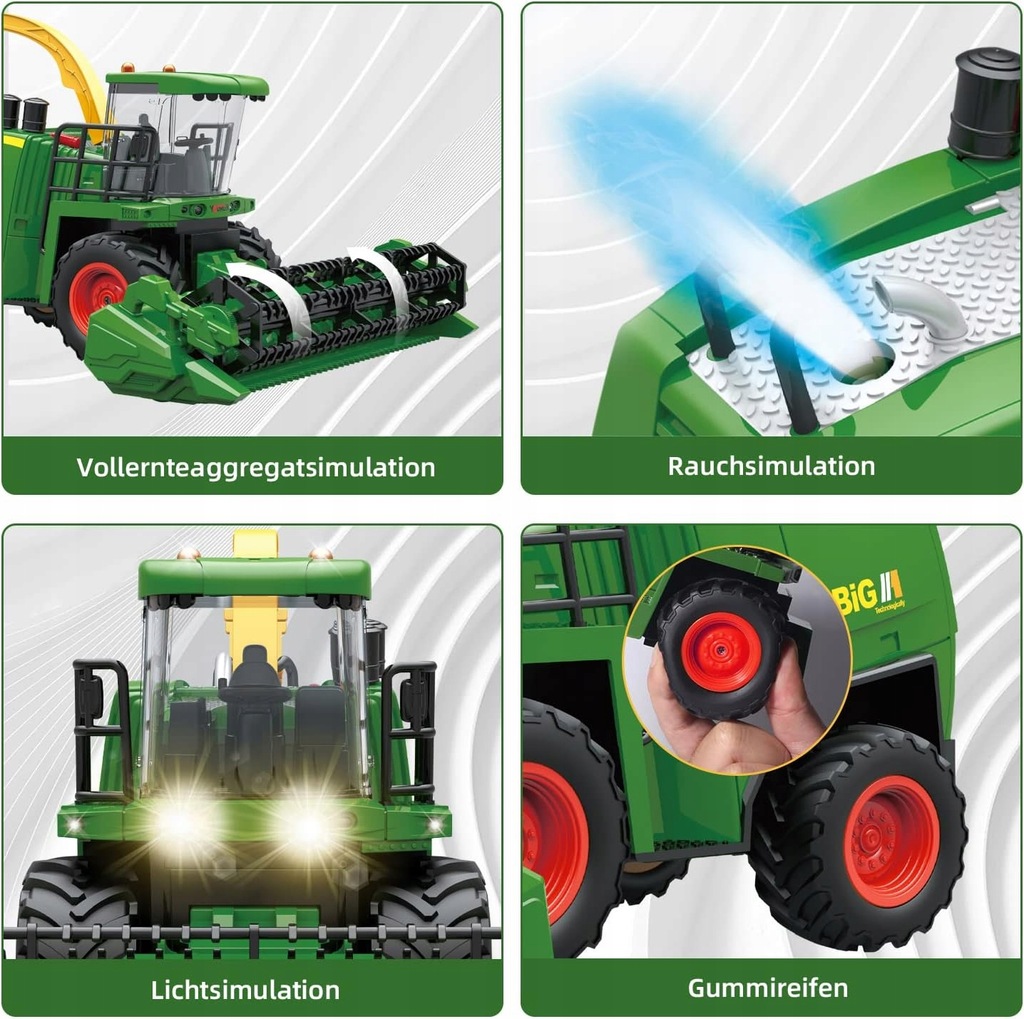⭐ Функція дистанційного керування дозволяє керувати комбайном за допомогою пульта дистанційного керування, що додатково підвищує реалістичність і задоволення від гри. Крім того, комбайн виділяє водяну пару, що імітує вихлопні гази, що надає йому автентичності. У набір входить пляшка для води для поповнення резервуара.