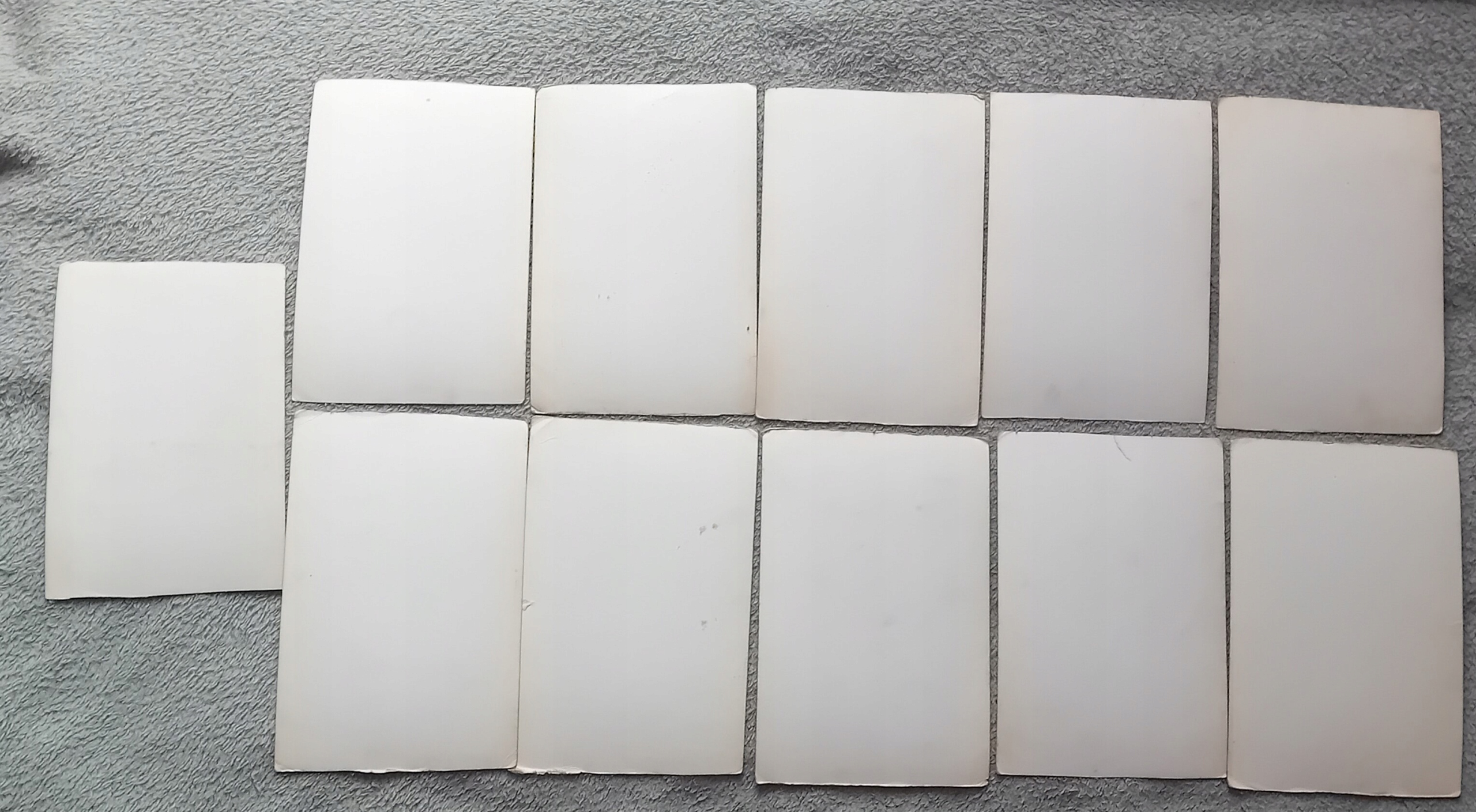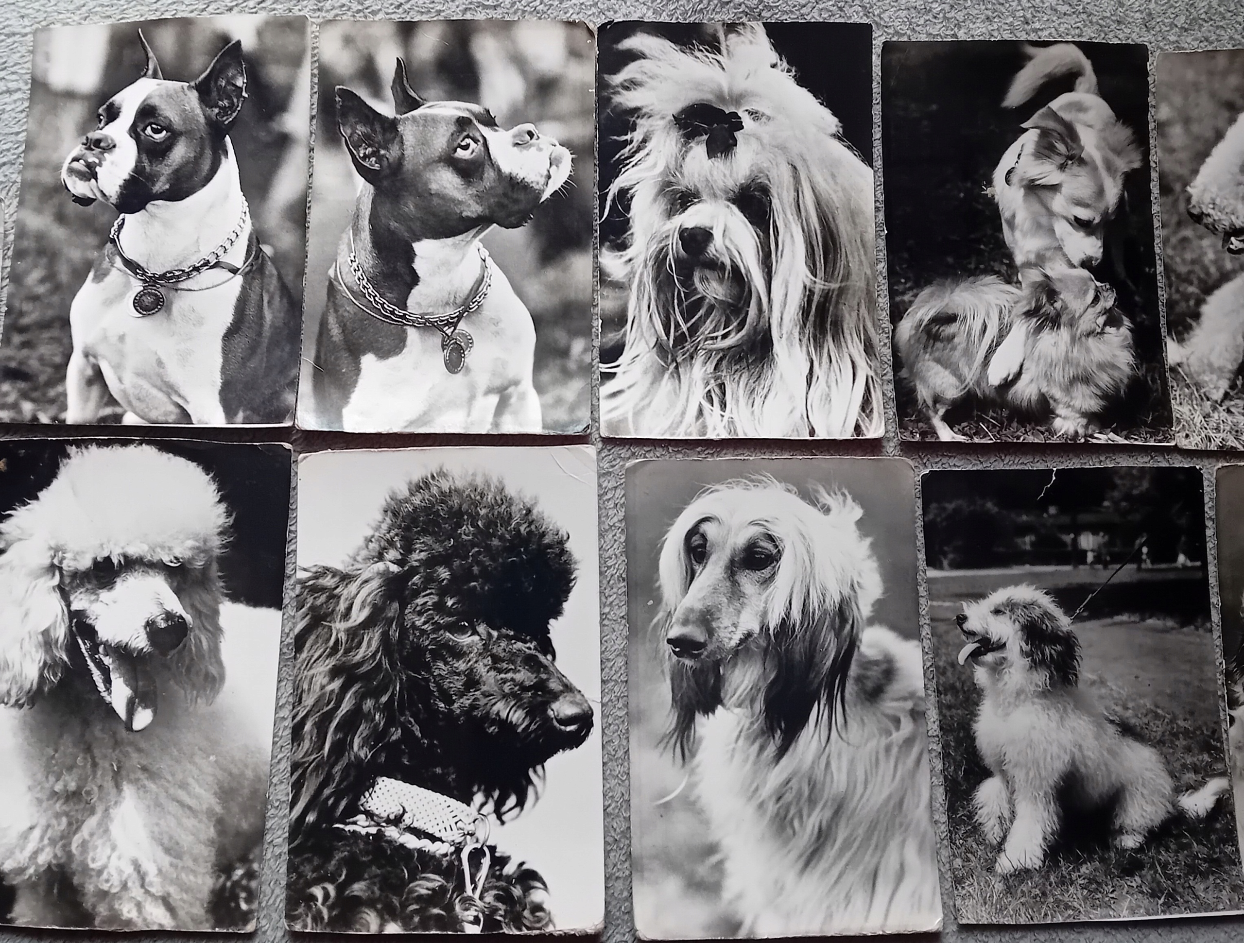 Продам набір з 11 чорно-білих листівок із зображенням порід собак, ймовірно, зроблені на рубежі 1960-х і 1970-х років, ймовірно, виробництва приватної фотостудії. На звороті відсутні анотації щодо виробника, року виробництва чи карбування. Тираж мабуть невеликий. Видно, що вони вирізані вручну, деякі з них вирізані криво. Стан середній - кути загнуті, на деяких листівках є заломи або невеликі надриви. Вони брудні зі спини. Ціна включає заставу.