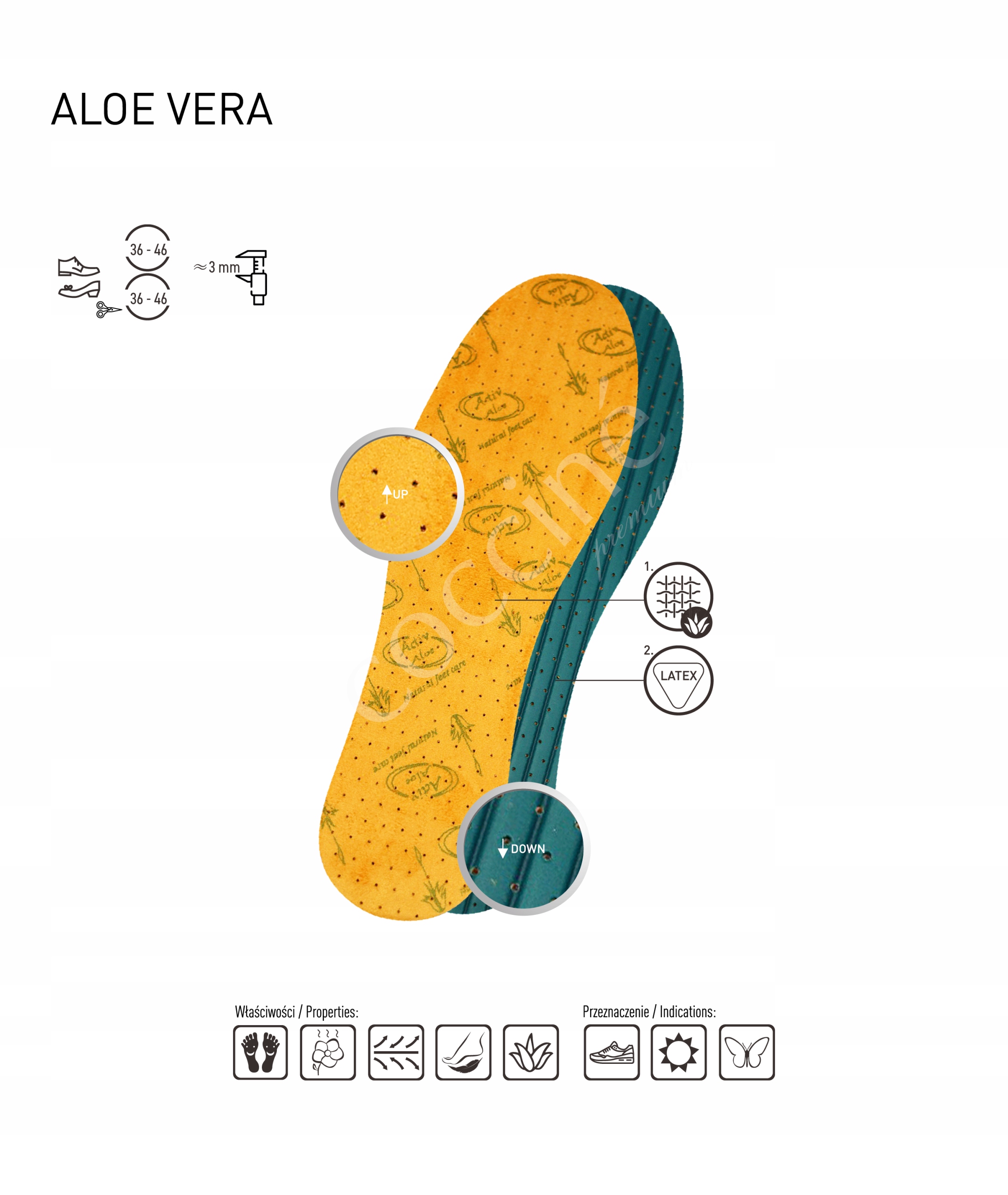 ВСТАВКА ALOE VERA - устілка зі свіжим ароматом, що містить екстракт алое. Забезпечує винятковий комфорт завдяки гнучкому латексу та м'якому, приємному на дотик текстильному покриттю.