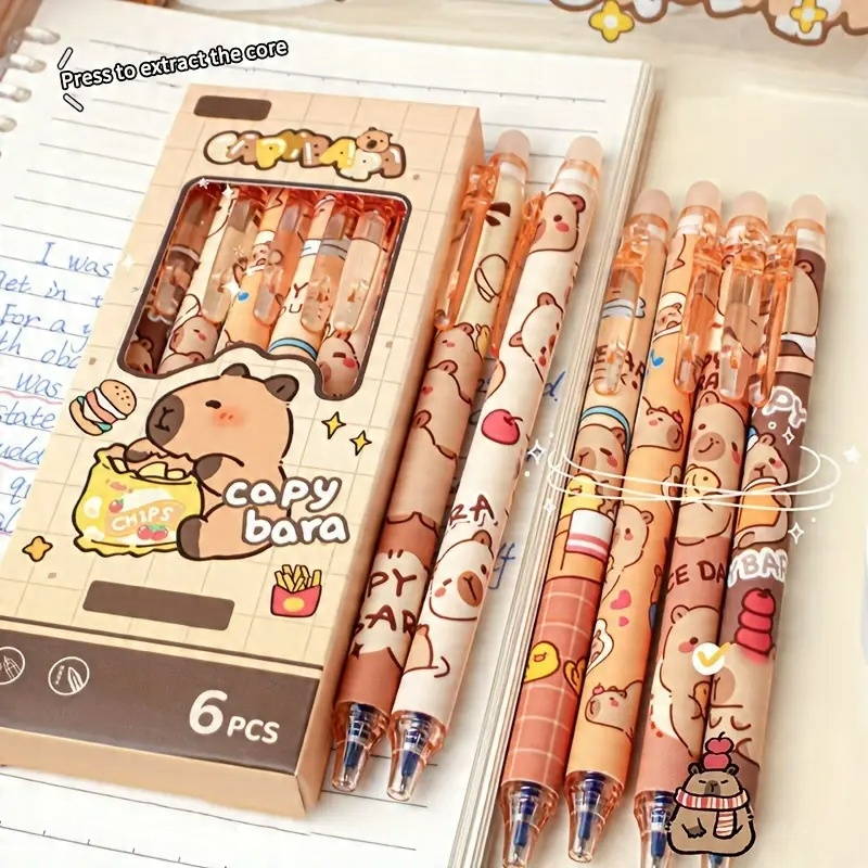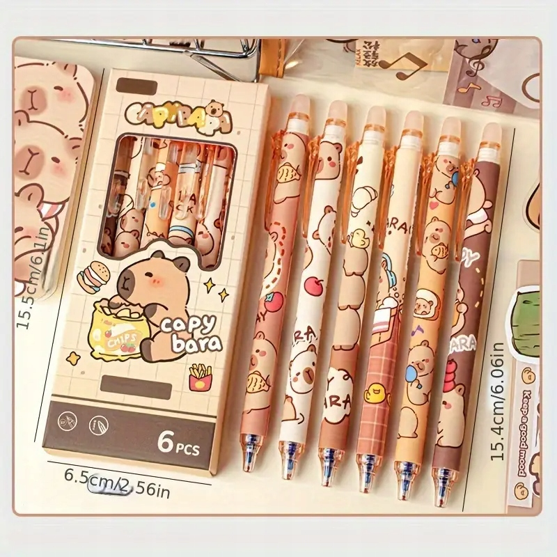 Набір з 6 ручок із зображенням капібари. Кожна ручка має різний дизайн.