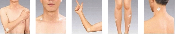 Приклади накладення пластирів за вухом, на пальці, на руках, на шиї та на ногах.