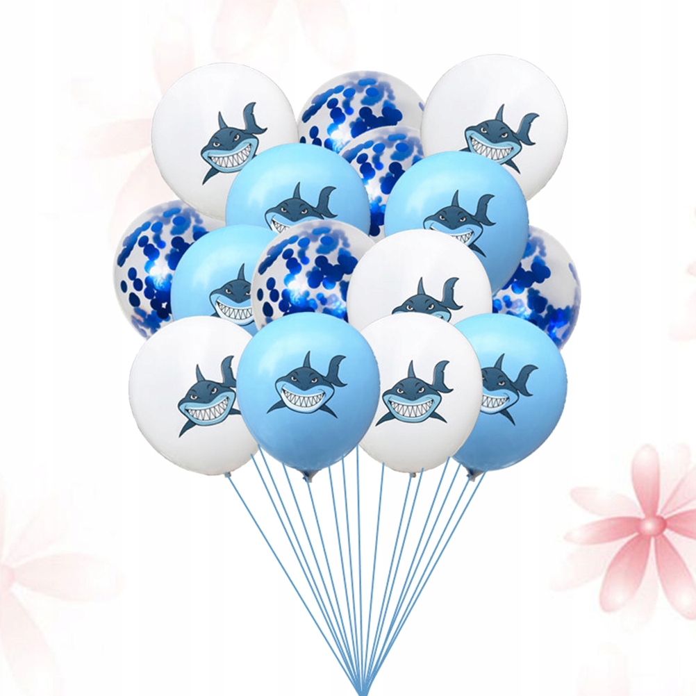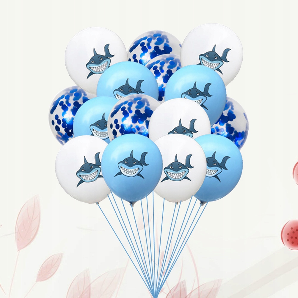 ✅ Загалом 15 штук, включаючи 5 білих повітряних кульок із зображенням акули, 5 світло-блакитних повітряних кульок із зображенням акули. і 5 повітряних куль із блискітками.