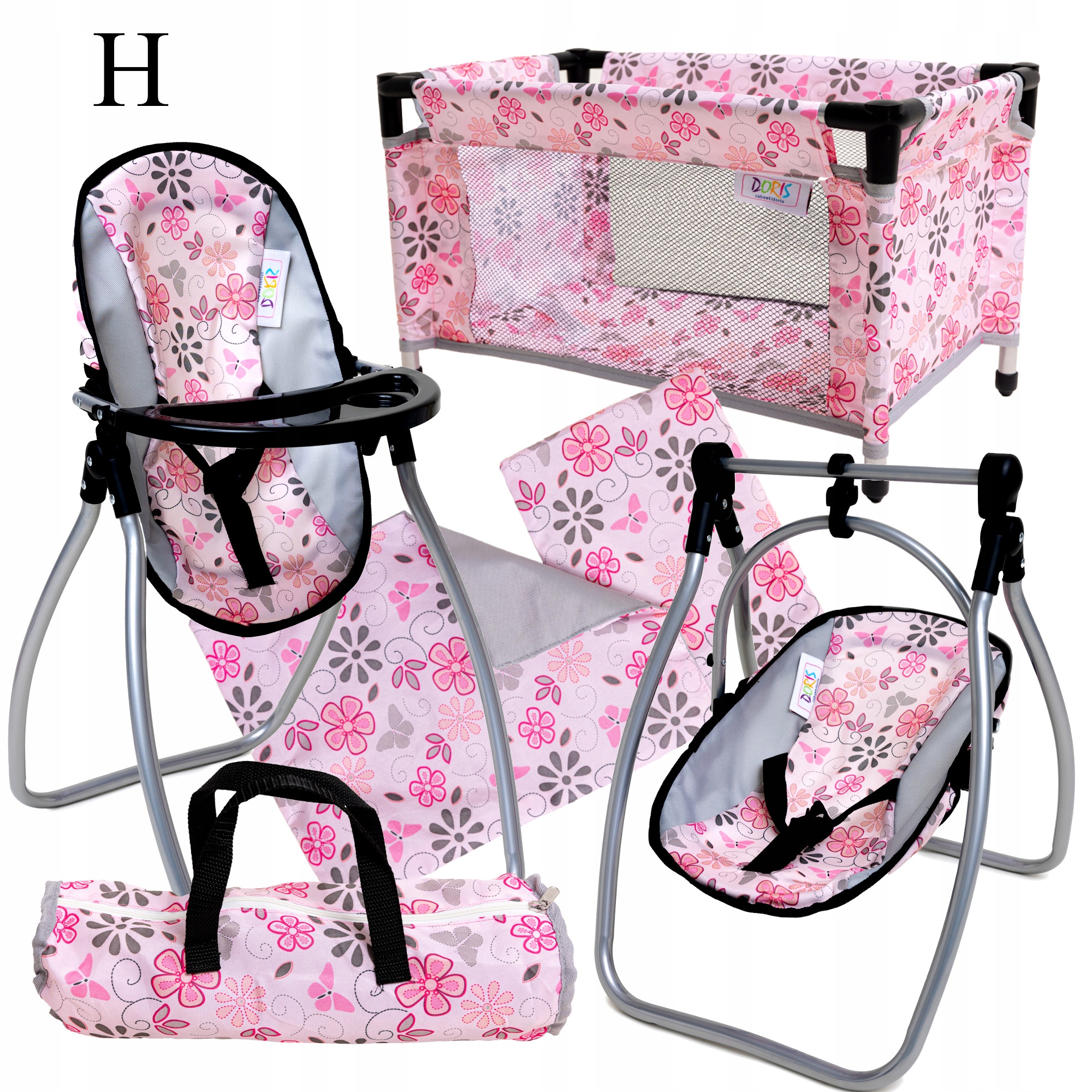 Набір від торгової марки DORIS, який дуже реалістично відображає справжнє туристичне ліжечко та дитяче крісло. Має багато функцій і можливостей для різноманітних розваг.