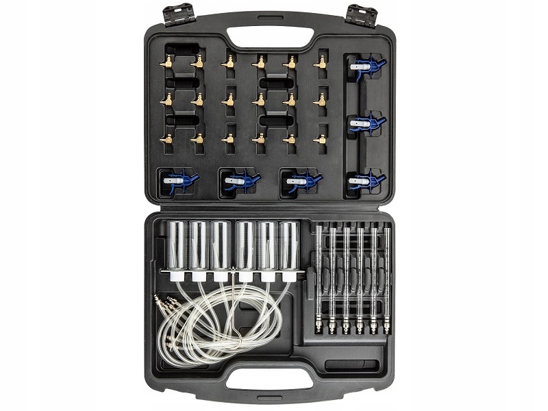 Набір для діагностики систем Common Rail: 6 шт. мірних стаканчиків зі шлангами, 6 шт. напірних трубок, 6 шт. роз’ємів для систем - Delphi, 6 шт. - Denso, 6 роз'ємів для систем - Siemens, 6 роз'ємів для систем - Bosch