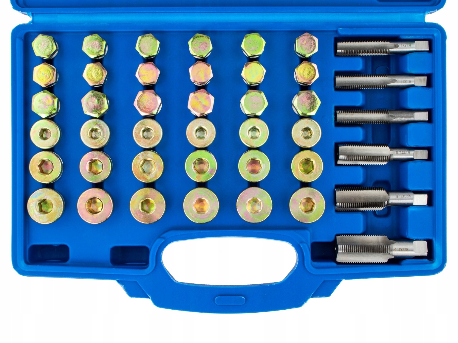 Набір для ремонту різьби піддона, коробки передач та інших зливних пробок. Підходить для більшості популярних різьб, які використовуються в легкових автомобілях і легких вантажівках. Набір призначений для використання в автомайстернях, СТО та сервісах.
