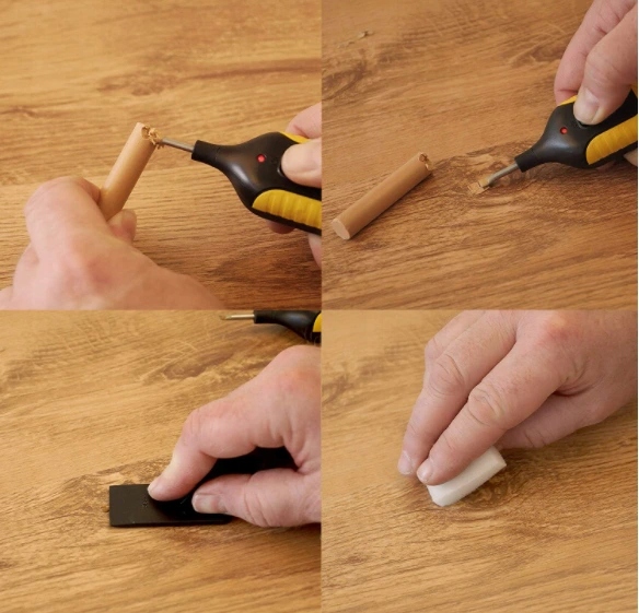 Набір дозволяє самостійно ремонтувати пошкодження на дерев'яних і деревоподібних поверхнях. Його також можна використовувати для відновлення пошкоджень на кам'яних і керамічних поверхнях. Віск, що входить до складу набору, усуває глибокі подряпини, тріщини, просвердлені отвори, забоїни та потертості. Воскові палички в 11 кольорах дозволять підібрати ідеальний колір для ремонту, напр. Варто відзначити, що віск можна змішувати до отримання потрібного кольору. Він заповнить щілину, а після висихання захистить відремонтований предмет.