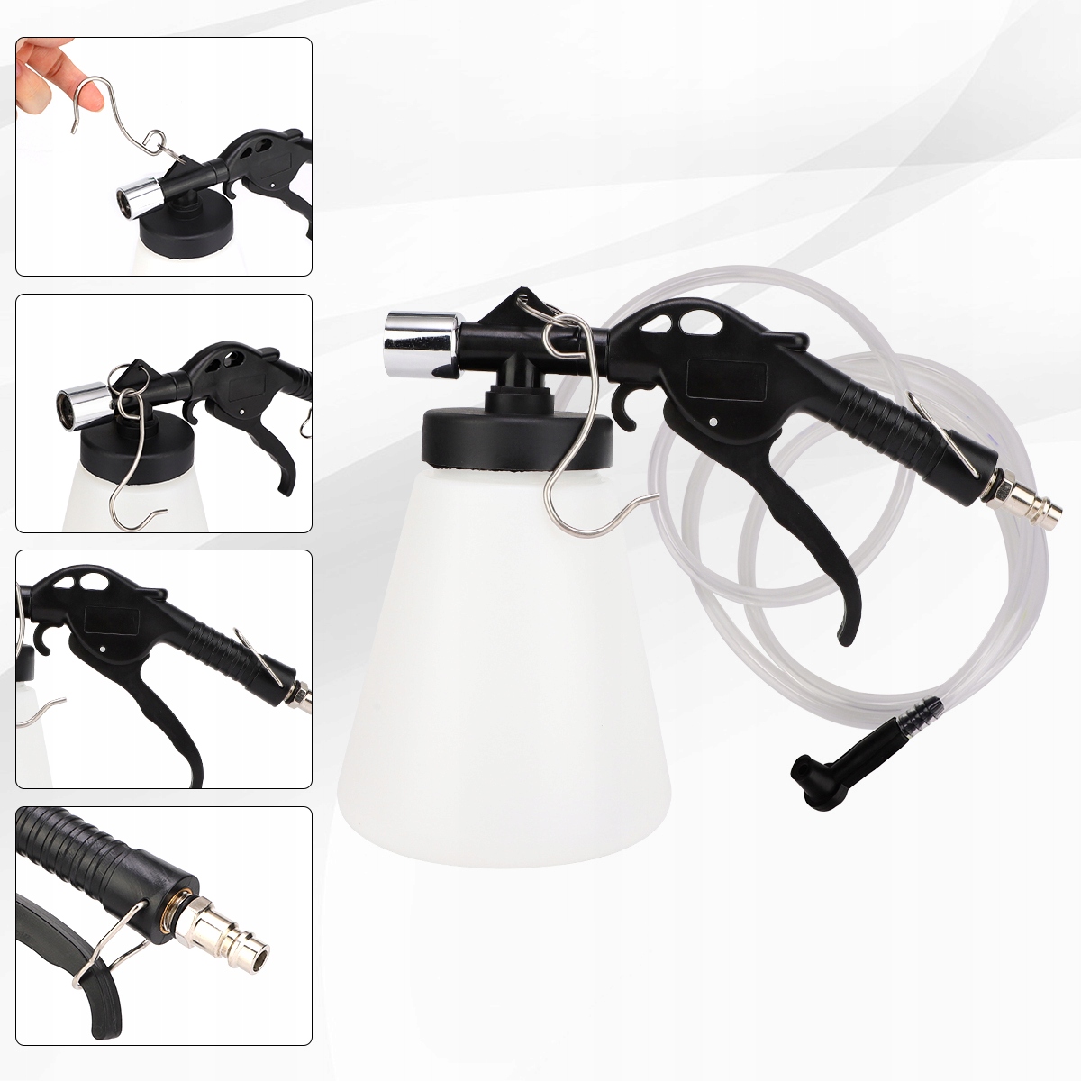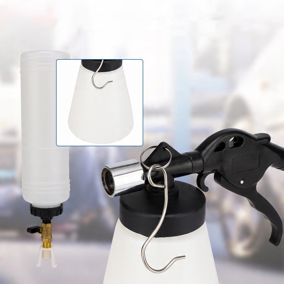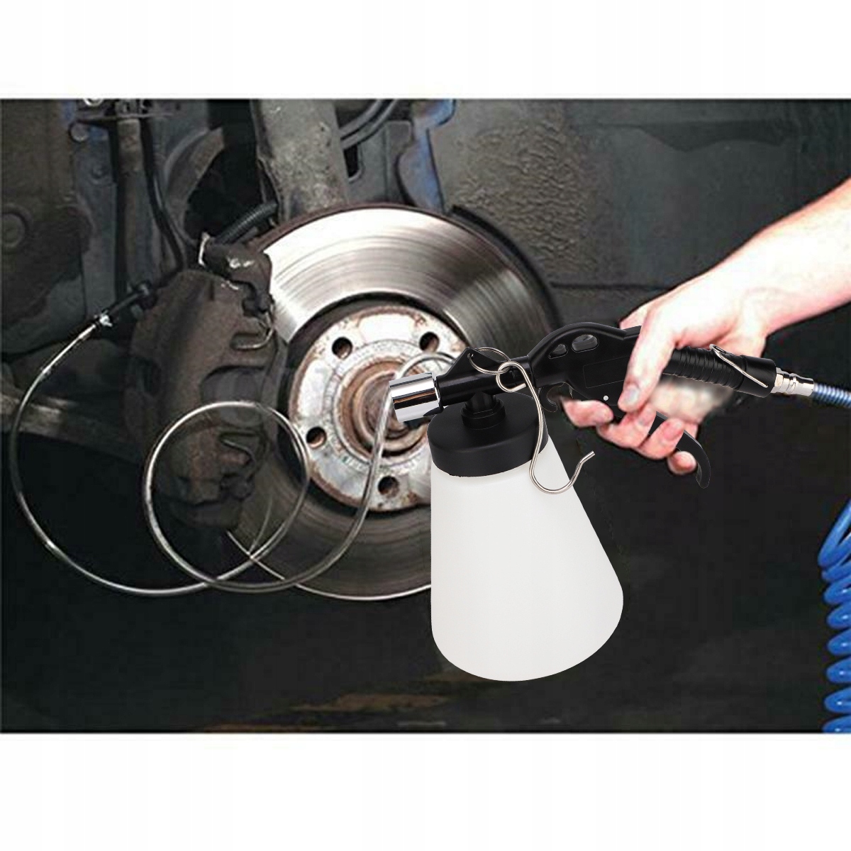 робочий тиск 6-12 барів із вакуумом 60% забезпечує легке та надійне вентиляцію гальмівних систем, зчеплення та рульових систем. Колекційний резервуар та шланги цього міцного гальмівного вентиляційного пристрою виготовлені з поліетилену, матеріалу, який не може бути пошкоджений хімікатами. Крім того, колективний контейнер гарантує, що гальмівна рідина буде зібрана екологічно чистою та неприємною способом.