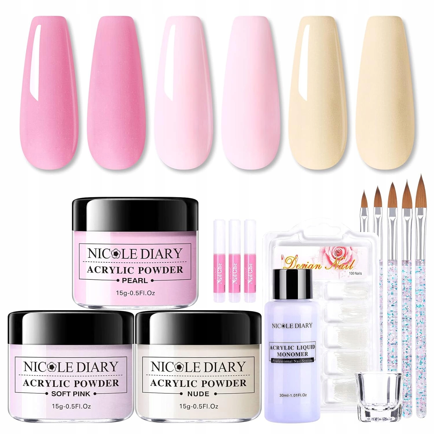 Стартовий набір акрилової пудри - акрилова пудра та рідкий набір НІКОЛЬ ДІАРІ включає акрилову пудру в 3 кольорах нюдового, рожевого та перламутрового та необхідний набір. Ідеально підходить для французьких нігтів, акрилових нігтів, різьблених квітів, нарощених нігтів і перманентних прикрас для нігтів