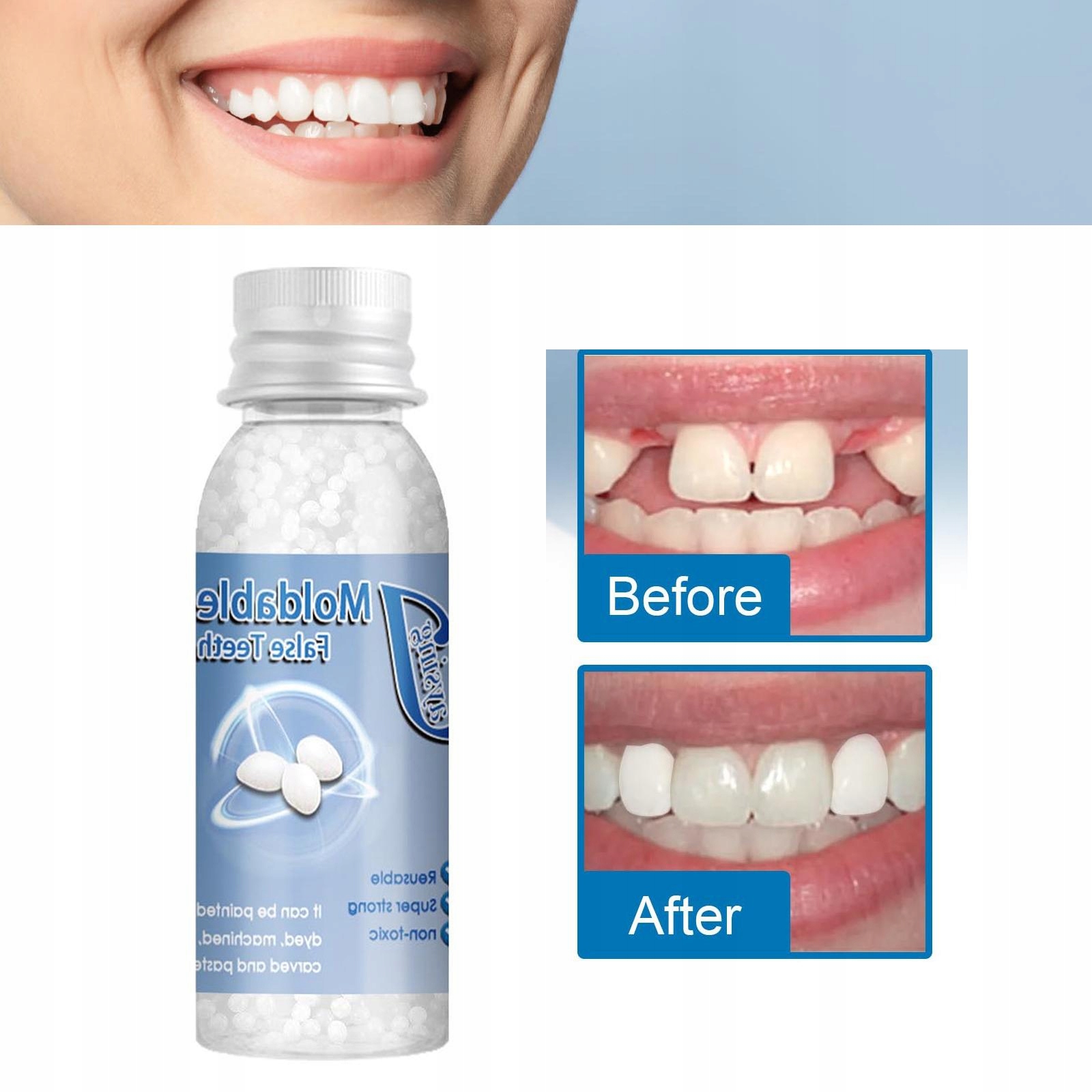 Простий у використанні: просто помістіть його в теплу воду, і його можна регулювати. Це забезпечить спосіб тимчасово заповнити відсутній зуб.