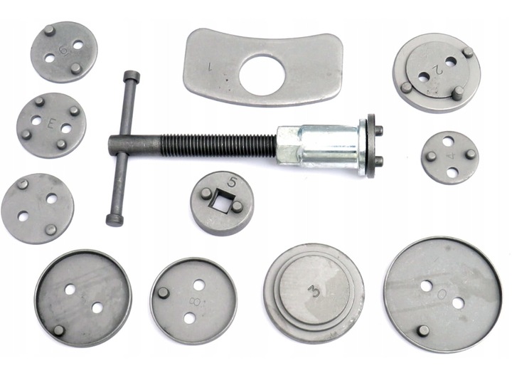 - Професійний набір із 12 предметів для втягування/віджимання поршнів в гальмівних циліндрах, необхідний при ремонті автомобілів, обладнаних дисковими гальмами. пластина, що відповідає даному поршню в осі.