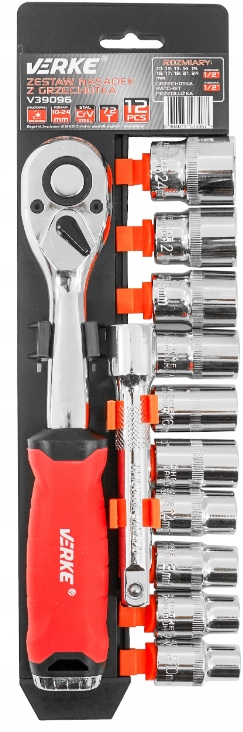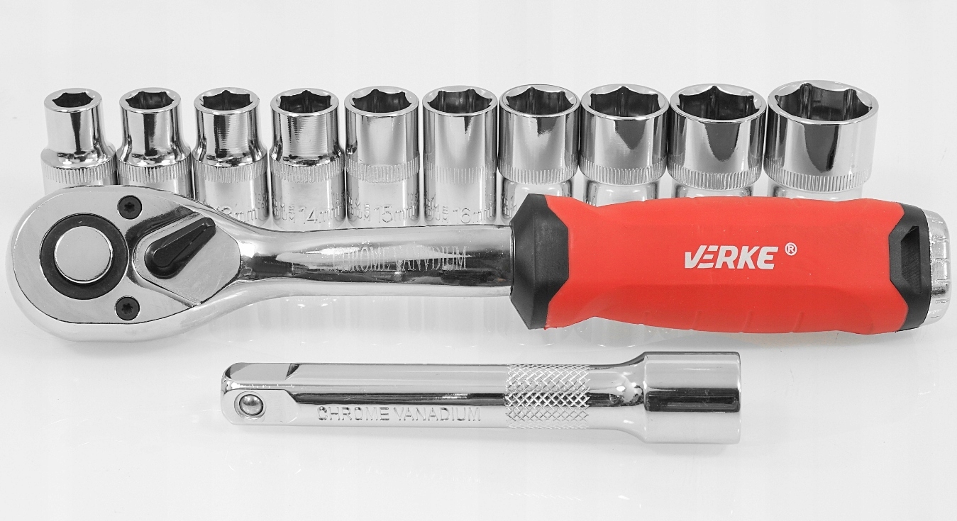 ZESTAW KLUCZY NASADOWYCH Z GRZECHOTKĄ I PRZEDŁUŻKĄ 1/2" 10-24MM VERKE