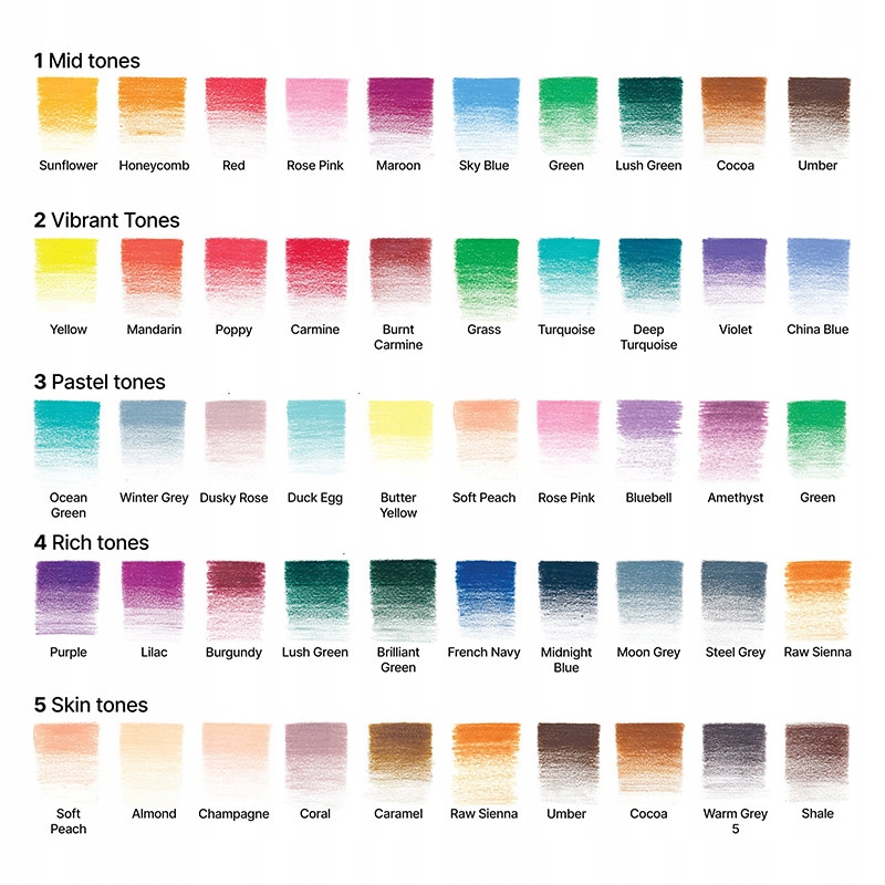 Колекція колекції Колекції , Winsor & Newton - Набір художніх олівців, 50 кольорів. / b> від бренду Winsor & Newton . М’яке олівцеве ядро характеризується високою пігментацією, що робить кольори виразними та їх насиченням під тиском. Круглі в перехресті, рамки, виготовлені з лакованої кедрової деревини, зручні в руці і легко загострюються. 50 кольорів розділений на 5 окремих тематичних кольорів. Кожен діапазон складається з 10 кольорів і має свій незалежний, закритий корпус - завдяки цьому ми можемо використовувати вибраний набір у міру необхідності - якщо ми готуємось до портрета, ми будемо використовувати діапазон тони шкіри , А для створення делікатних романтичних картин буде використовуватися набором пастельних тонів . Упаковка була розроблена функціонально, а висока якість олівців задовольняє вимогливих творців. > 4 3 - Пастельні тони