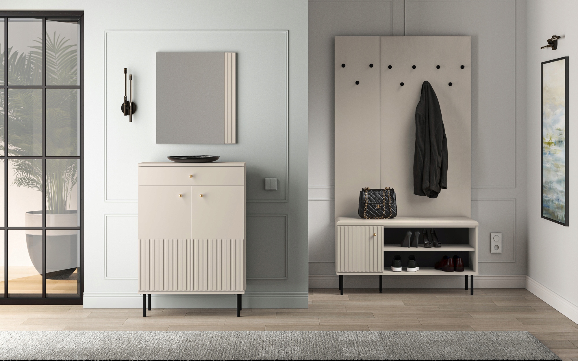 ZESTAW MEBLI DO PRZEDPOKOJU SZAFKA SIEDZISKO WIESZAK KREMOWY DROMA KONSIMO
