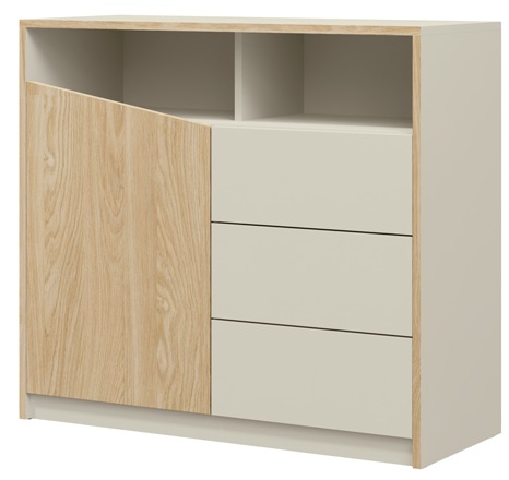 - комод з лівого боку має шафу з повною передньою частиною, за якою знаходиться полиця, з правого боку є 3 ящики, а під верхньою стільницею є два відкритих простору