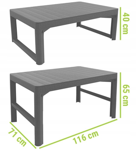 Практичний стіл LYON з великою стільницею, розміри: 116 х 71 см, має складні ніжки. Завдяки цьому він функціонує як низька лава або високий обідній стіл. Це робить набір багатофункціональним і створеним з урахуванням зручності користувача.