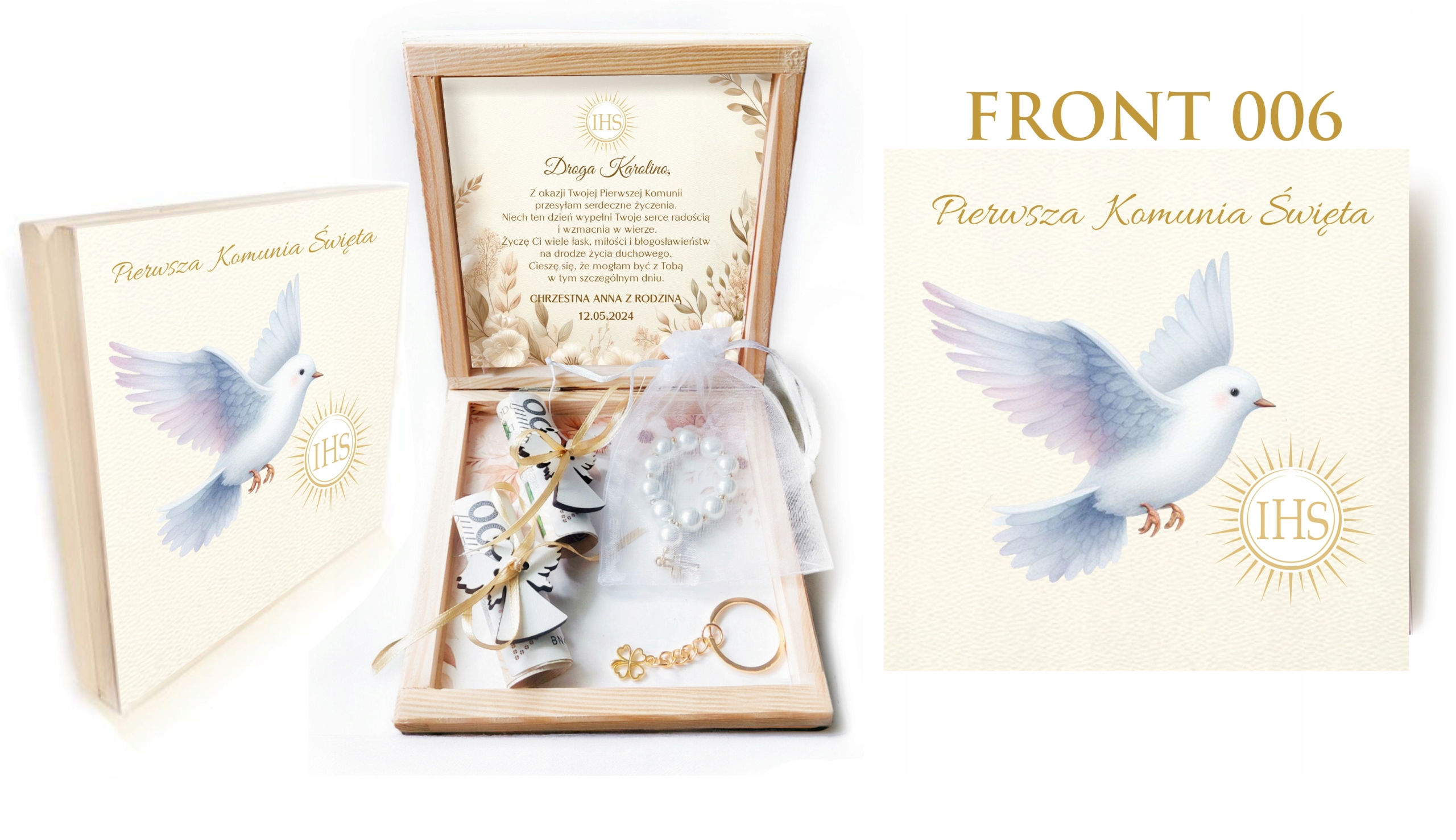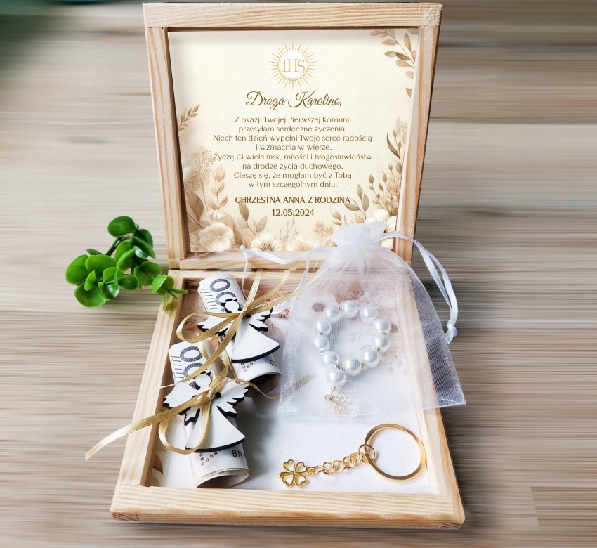 ZESTAW NA PAMIĄTKĘ PIERWSZEJ KOMUNII ŚWIĘTEJ PUDEŁKO NA PIENIĄDZE KOMUNIA