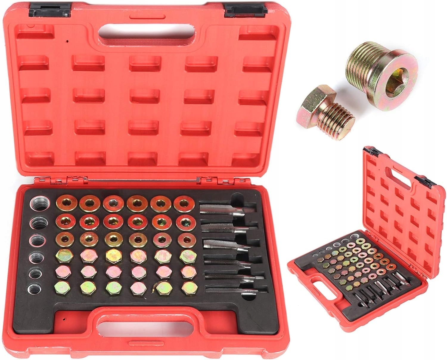 Набір кранів і пробок для простого ремонту різьби масляного піддона, коробки передач та інших зливних пробок. Підходить до більшості різьб, які зазвичай використовуються в легкових автомобілях і легких вантажівках. Набір призначений для автомайстерень, ремонтних майстерень і сервісів.
