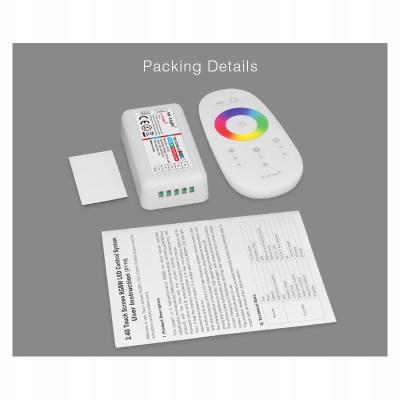 Пульт дистанційного керування живиться від 2 батарейок 1,5 В AAA (не входять у комплект) і використовується для керування кольором та інтенсивністю світло. Зв'язок із контролером відбувається за допомогою радіочастотних хвиль, що полегшує керування - діапазон дистанційного керування становить до 30 м.