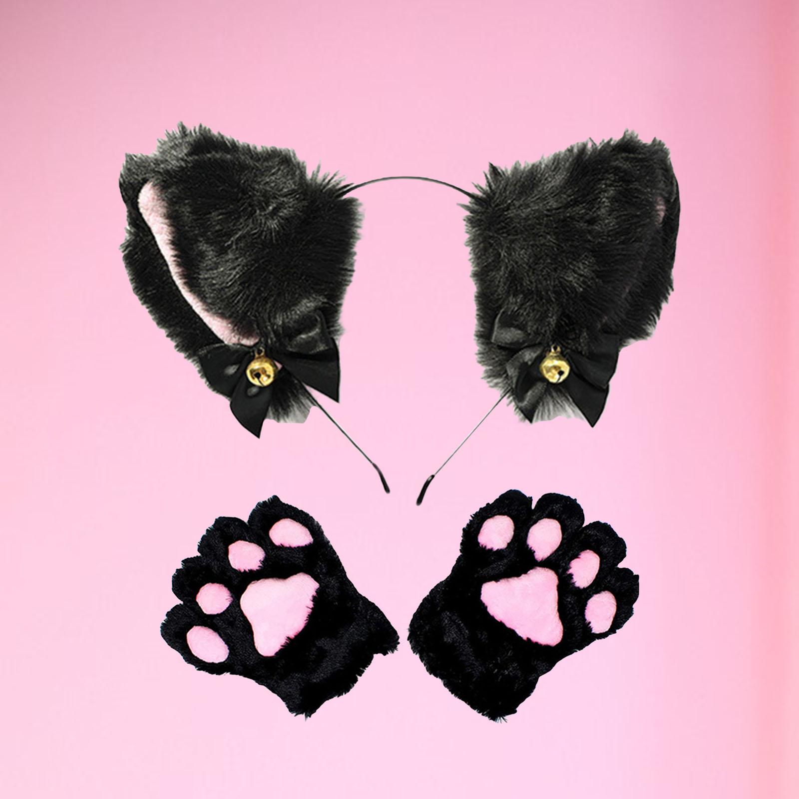Zestaw pluszowych opasek i rękawiczek z uszami kota. Nakrycia głowy z dzwoneczkiem. 2 szt