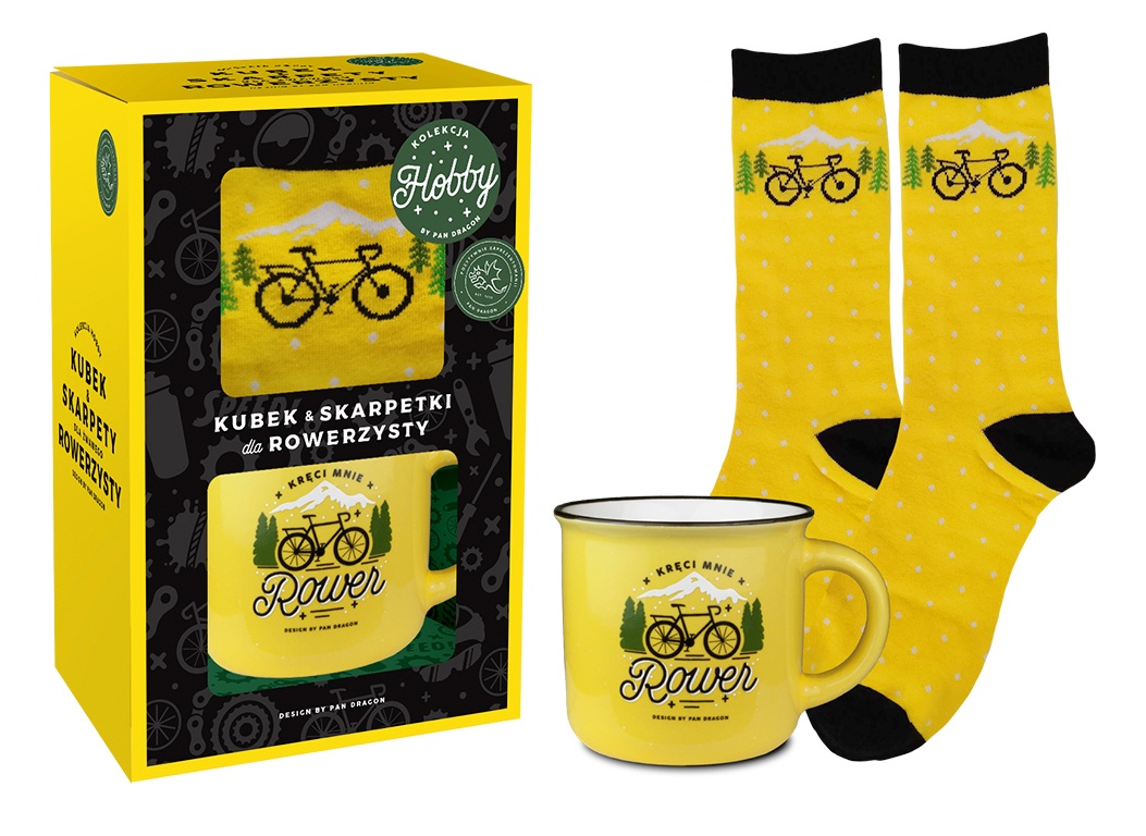 Набір для велосипедиста, що складається з кухля з написом «Мені цікавий велосипед» і шкарпеток. Набір упакований в декоративну коробку, готовий до подарунка!