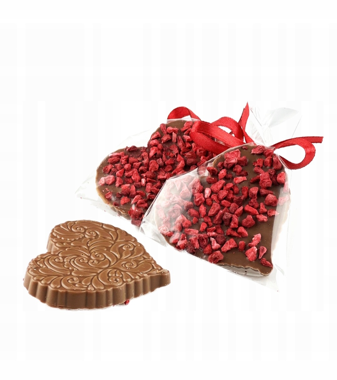 - Молочний шоколад Mini Heart із ліофілізованою малиною: бренд Chocolate Bush, органічний продукт, що не містить барвників, глютену чи пальмової олії. Етикетка на звороті.