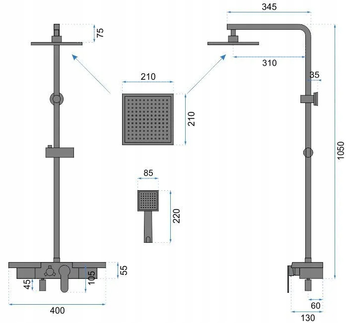 - У набір входить: Полиця з вбудованим у крані та виливі, душовий шланг із трубкою, сталевий тропічний душ