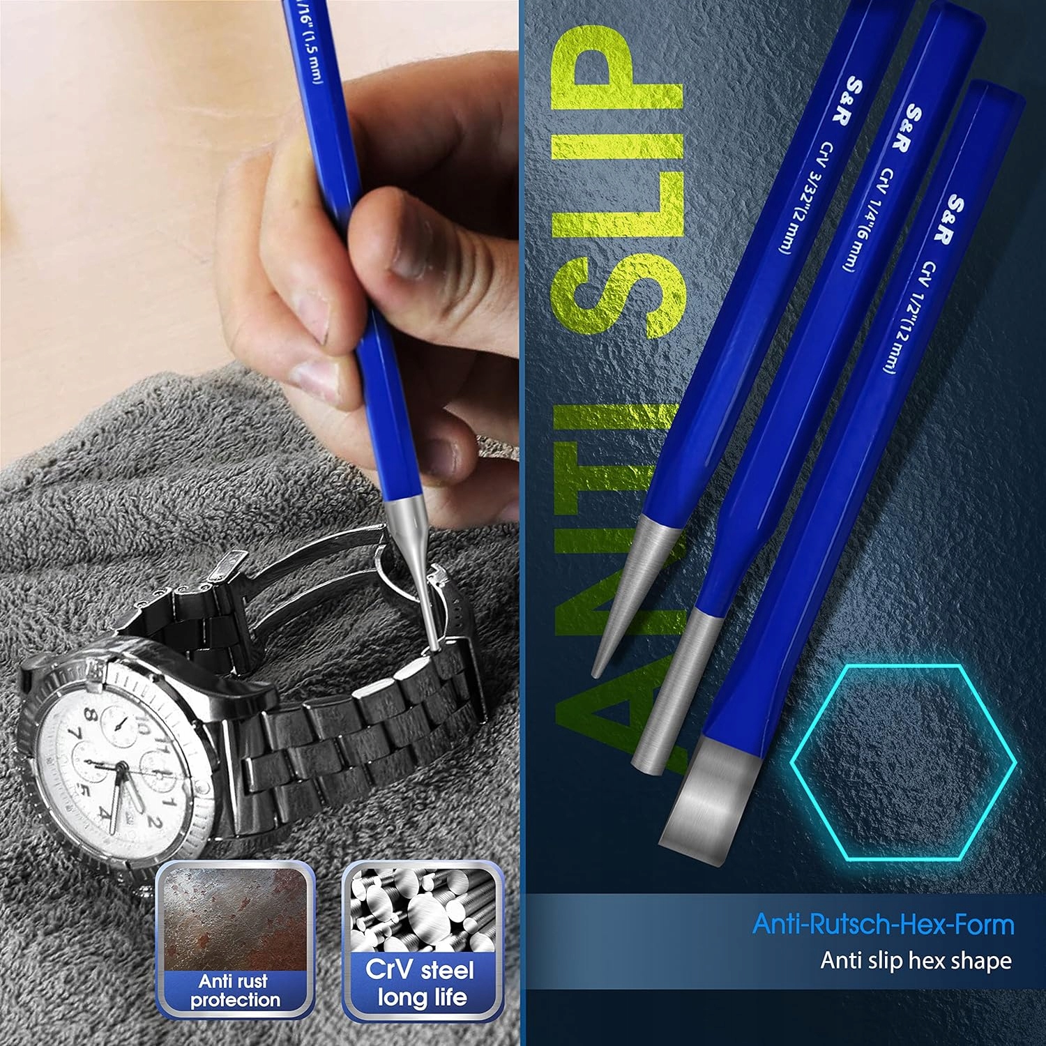 Набір з 12 предметів з центральним пуансоном, зубилом, пуансоном та пуансон, виготовлений з високоякісної хром-ванадієвої сталі, у міцній коробці для зберігання