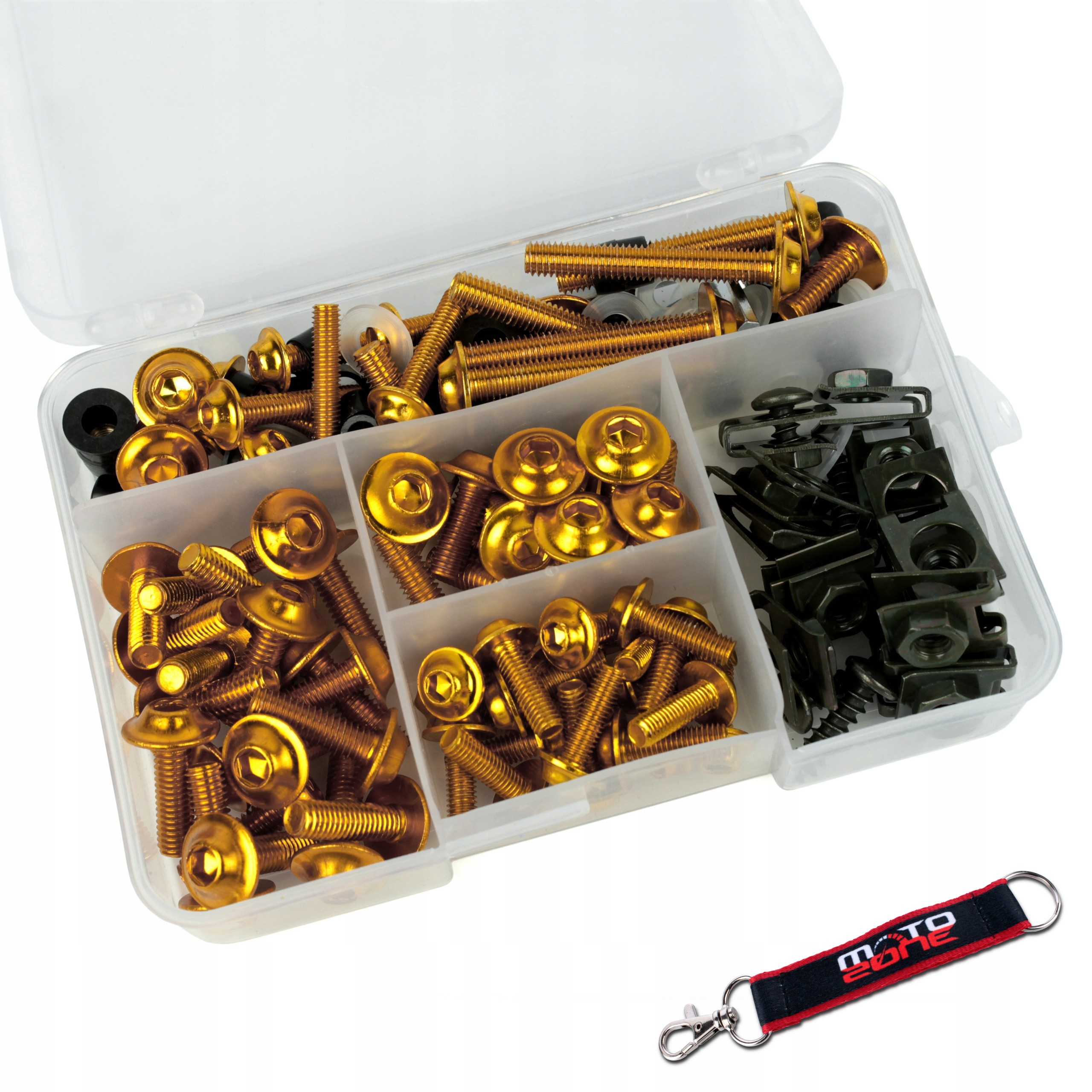 ZESTAW ŚRUB ŚRUBKI OWIEWKI MOTOCYKLOWE ALUMINIOWE ZŁOTE + Haftowana smycz brelok MOTO-ZONE krótka