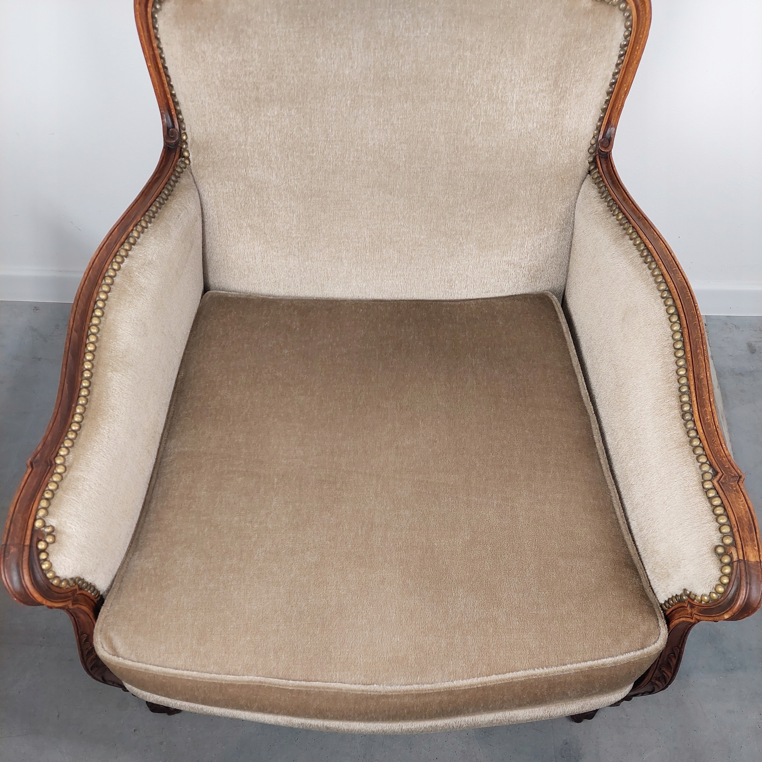 Стильний диванний гарнітур у стилі Чіппендейл, оббитий бежевим оксамитом, весь на дубових каркасах. У комплект входить 2-х місний диван і крісло. Меблі мають незначні сліди використання, в основному ніжки, 4 з них і правий підлокітник крісла мають невеликі пошкодження дерева (останнє фото), але це не впливає на використання. Оригінальна конструкція, сидіння використовують пружини, що підтримуються джутовими ременями. Матеріал без дірок, плям та інших помітних пошкоджень (одна невелика пляма з внутрішньої сторони правого боку дивана), у відмінному стані, не потертий, можна відразу розміщувати та використовувати. Детальні фото нижче