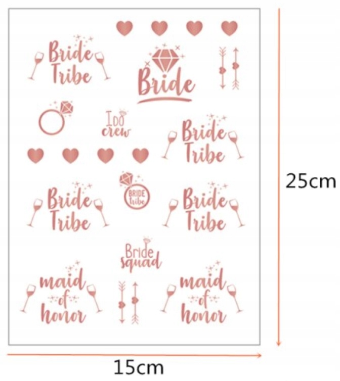 Набір складається з білої кришки з нареченою на напис, діадема в кольорі рожевого золота та набору татуювань, що миються. ідеально підходить для холостяка. Майбутня наречена зможе відчути особливу подяку такому набору. Крім того, набір може створити сувенір з цієї унікальної події. З іншого боку, татуювання зроблять вечірку приємнішою, кожен учасник .