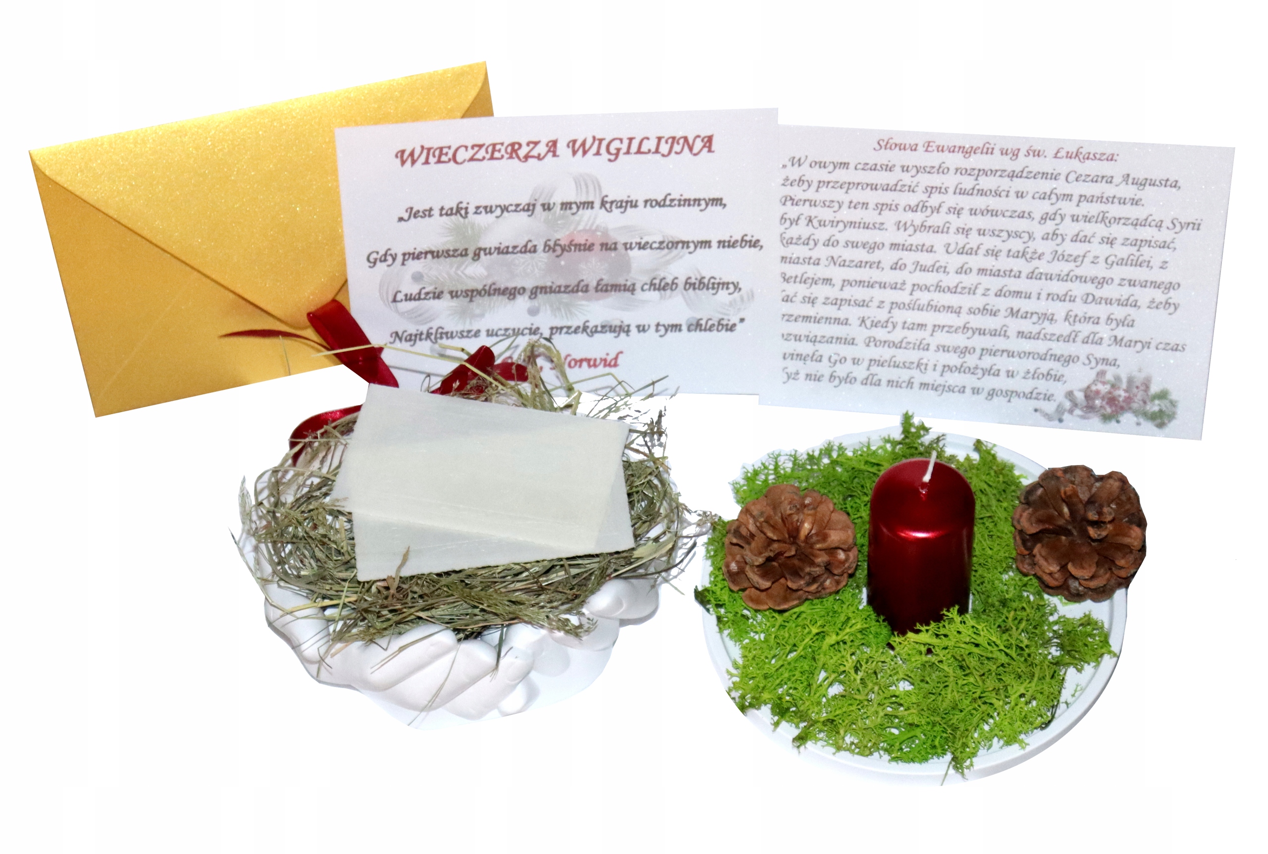 Ідеальний набір для святвечора. Облатка накладена на сіно та гіпсову ручку. Крім того, червона свічка, що стоїть на моху chrobotek з шишками. У набір також входить конверт зі словами з Євангелія від св. Люк прочитав, перш ніж розламати облатку.