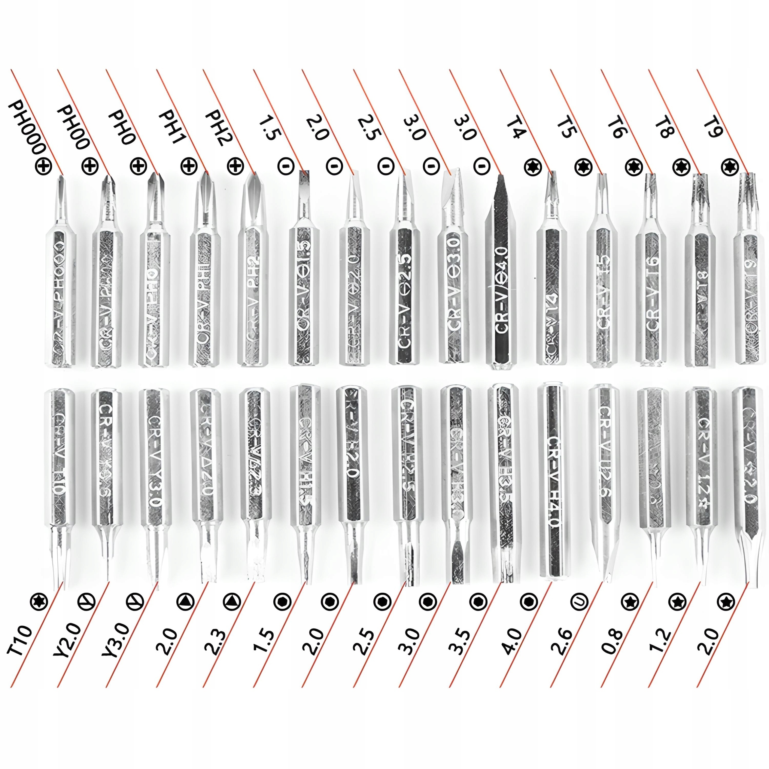 Цей багатий набір наконечників зі зручною ручкою, покритою протиковзким покриттям і довгим подовжувачем, надасть вам необмежені можливості використання. Наш набір містить усі популярні наконечники, зокрема: 5 x Philips, 5 x плоских, Torx розмірів від T4 до T10, шестигранних від H1.5 до H4.0, Y розмірів 2.0 і 3.0, трикутних 2.0 і 2.3, 3x Pentalobe і U 2,3 мм.