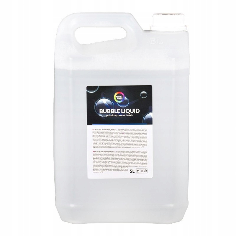 LIGHT4ME BUBBLE LIQUID 5L - це професійна, без запаху та дуже ефективна рідина для бульбашкових машин на основі суміші чистої води та неіоногенних поверхнево-активних речовин. Рішення широко використовується, особливо в індустрії розваг. Його можна використовувати для створення сценічних ефектів під час вистав та різноманітних заходів. Створені з нього мильні бульбашки мають міцну структуру, і в той же час вони легкі і довго тримаються в повітрі. Бульбашкова рідина Light4Me особливо рекомендована для аніматорів ігор та розваг для дітей, парків розваг, компаній, що організовують різноманітні заходи, а також приватних осіб.