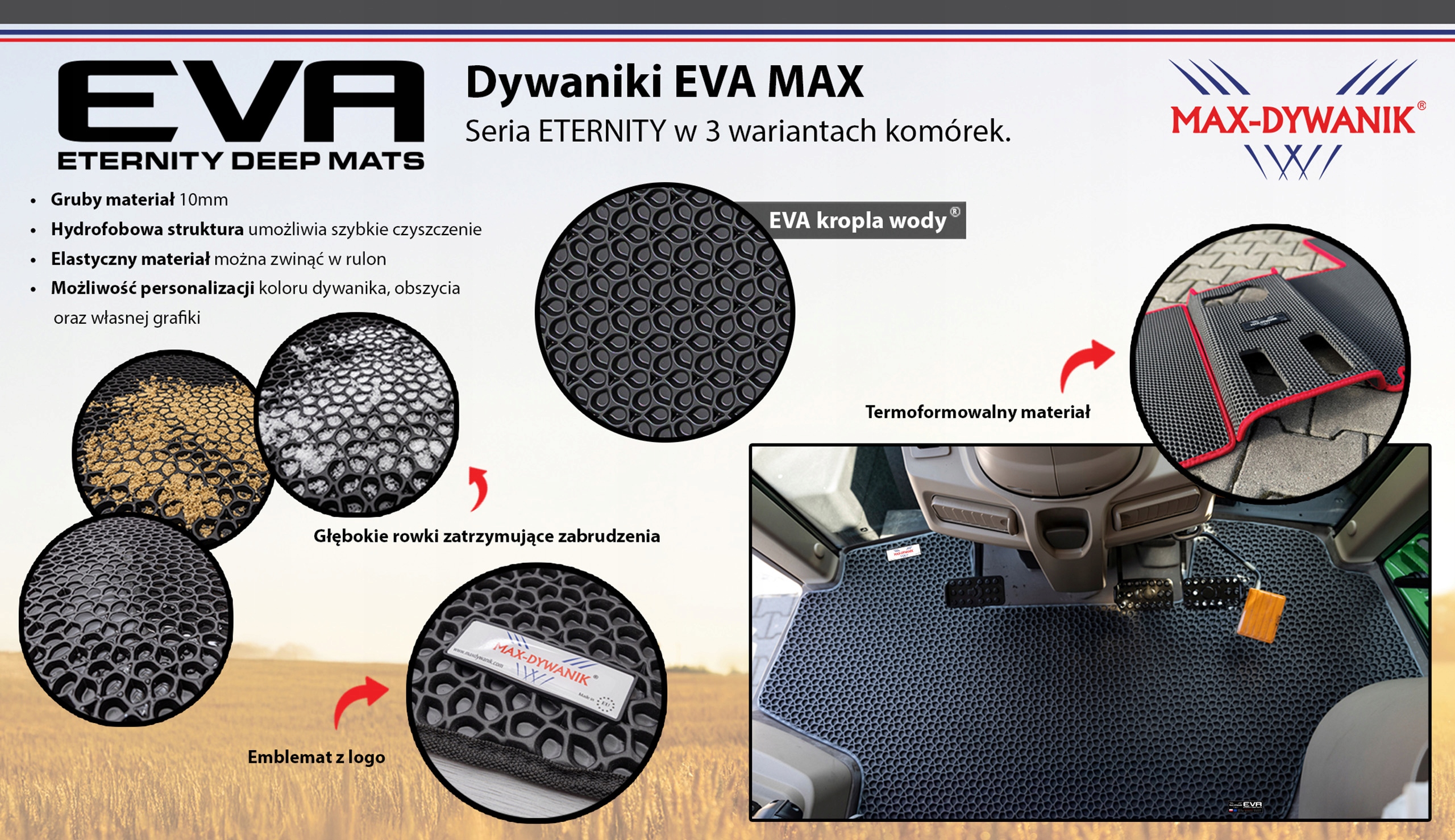 Предметом пропозиції є килим EVA серії EVA Eternity Deep Mats виробництва відомої польської компанії MAX-DYWANIK. Призначений для сільськогосподарської техніки, виготовлений з унікальним малюнком краплі води, який ефективно утримує забруднення всередині клітин, забезпечуючи чистоту та порядок. Килимок оброблений естетичною чорною стрічкою - гарантія якості та точності виконання.