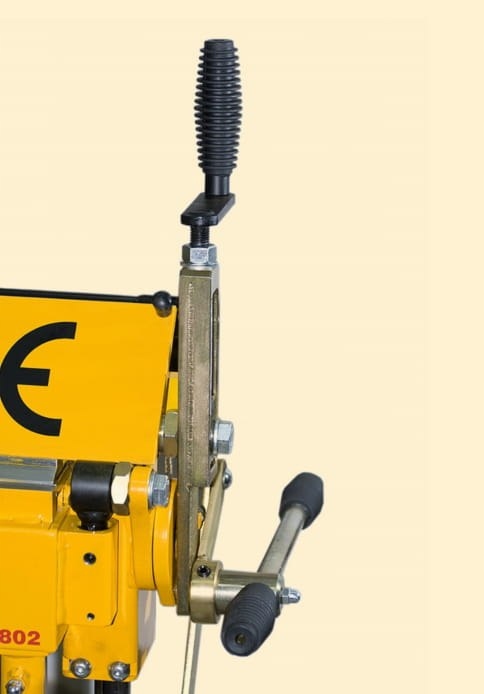 Верстат може бути оснащений пристроєм, який успішно замінює верстат для згинання сегментів при низьких витратах. Це два елементи, які піднімають верхню балку на будь-яку висоту, але не вище 90 мм. Наприклад: ми повинні зігнути лист металу з чотирьох сторін розмірами 500 мм х 500 мм і висотою сторін 50 мм. Рівномірно підніміть натискну балку за допомогою кривошипів на висоту 50 мм, дивлячись на шкалу, і зафіксуйте її на цій висоті. Лист потрібно зрізати по кутах. Потім потрібно виготовити або купити готовий профіль висотою 50 мм і довжиною 500 мм. Замість металу з успіхом можна використовувати брусок листяних порід. Час налаштування можна порівняти з часом налаштування сегментозгинального верстата. Однак пам’ятайте, що потрібно врівноважити силу тиску верхньої балки і вставити біля напрямних стовпів блоки висотою 50 мм. Підготовлена таким чином згинальна машина готова до згинання коробки (форми).