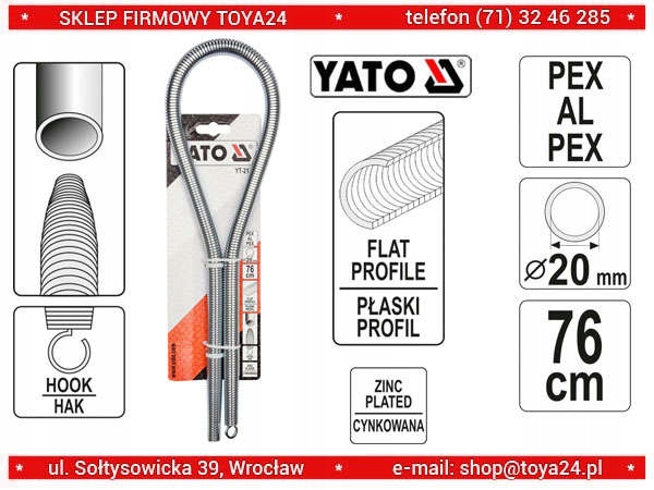 Внутрішня пружина для згинання труб PEX-AL-PEX або PERT-AL-PERT діаметром 20 мм (зовнішня). Загальна довжина 76 см. Плоский профіль пружинного дроту запобігає утворенню ребер, що віддруковуються на поверхні зігнутої труби. Конічний кінець одного кінця пружини полегшує її ковзання в трубу. Гачок на іншому кінці полегшує витягування з довгих ділянок труби. Пружини оцинковані, що робить їх стійкими до корозії та підвищеною стійкістю до стирання.
