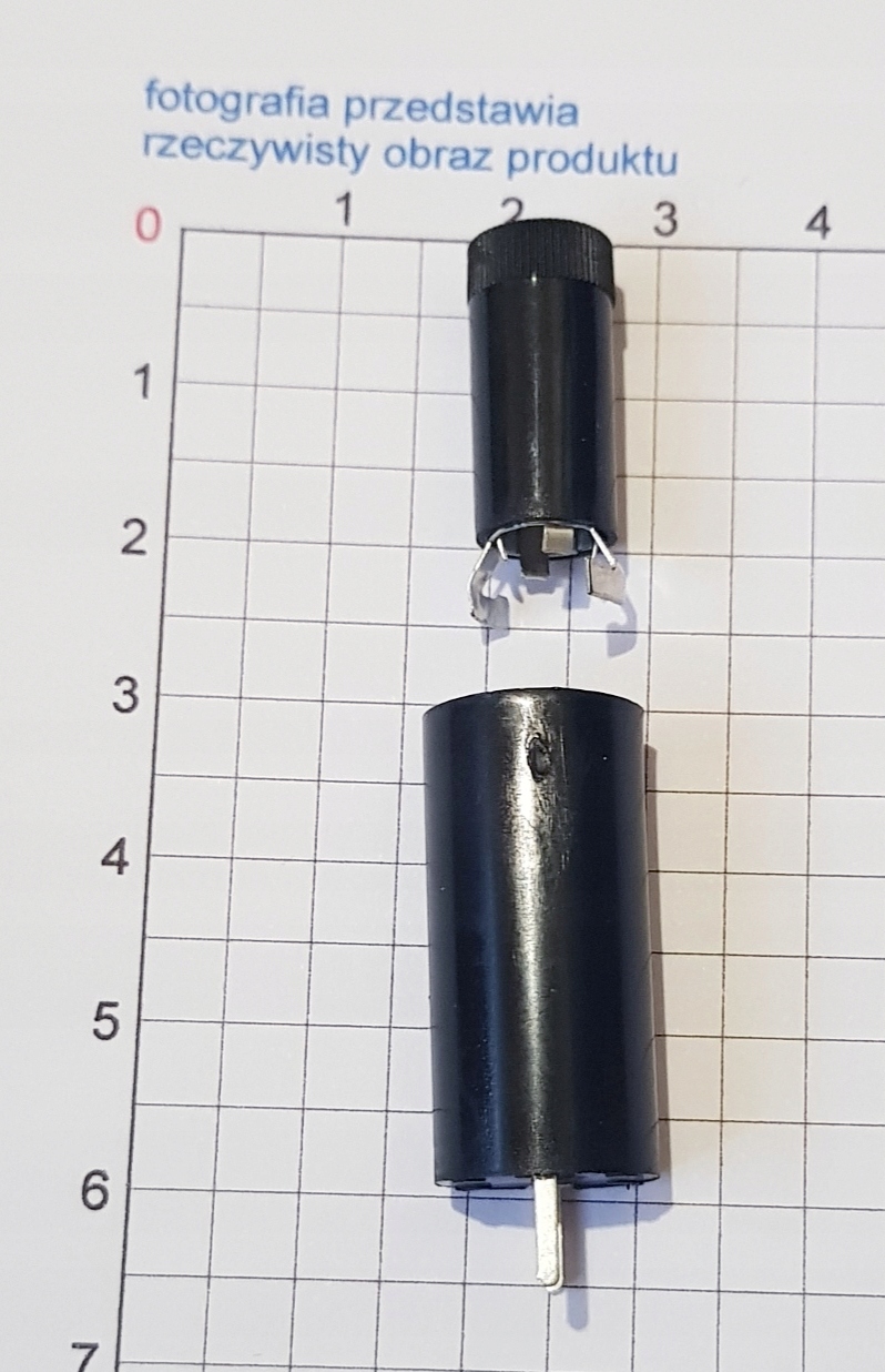вертикальний тримач для циліндричних запобіжників 5×20мм, параметри 250V AC / 6A, призначений для монтажу на друкованій платі (для друку), з кроком контактів 10мм