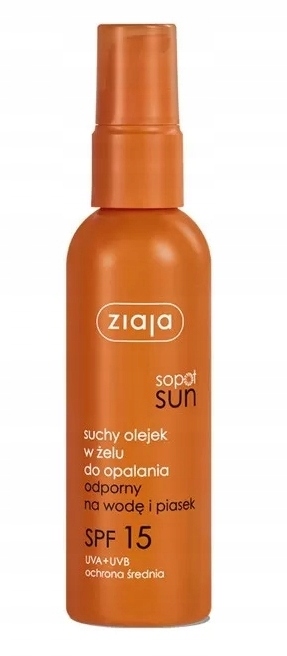 сухе масло в гелі Ziaja. Сонячні опіки та передчасне старіння шкіри. Це веганський, стійкий до води та ручки. Він має легку консистенцію гелю, який комфортно поширюється на шкіру і не залишає липкого шару. Забезпечує середній захист від шкідливих ефектів сонячного випромінювання УФА та УФБ, завдяки вмісту в складі SPF15. Його можна використовувати на мокрому і сухому шкірі. Косметика доступна в пляшці з атомізатором 90 мл.