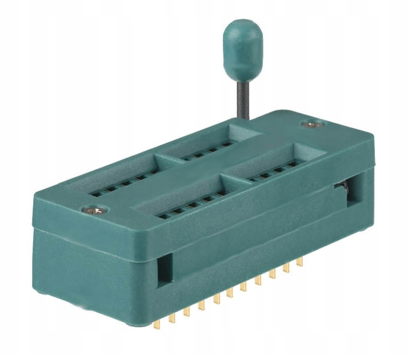 Прецизійний випробувальний стенд ZIF для інтегральних схем. Він має важіль, за допомогою якого багатоконтактний роз’єм із позолоченими контактами кріпиться до корпусів інтегральних схем чи інших модулів.