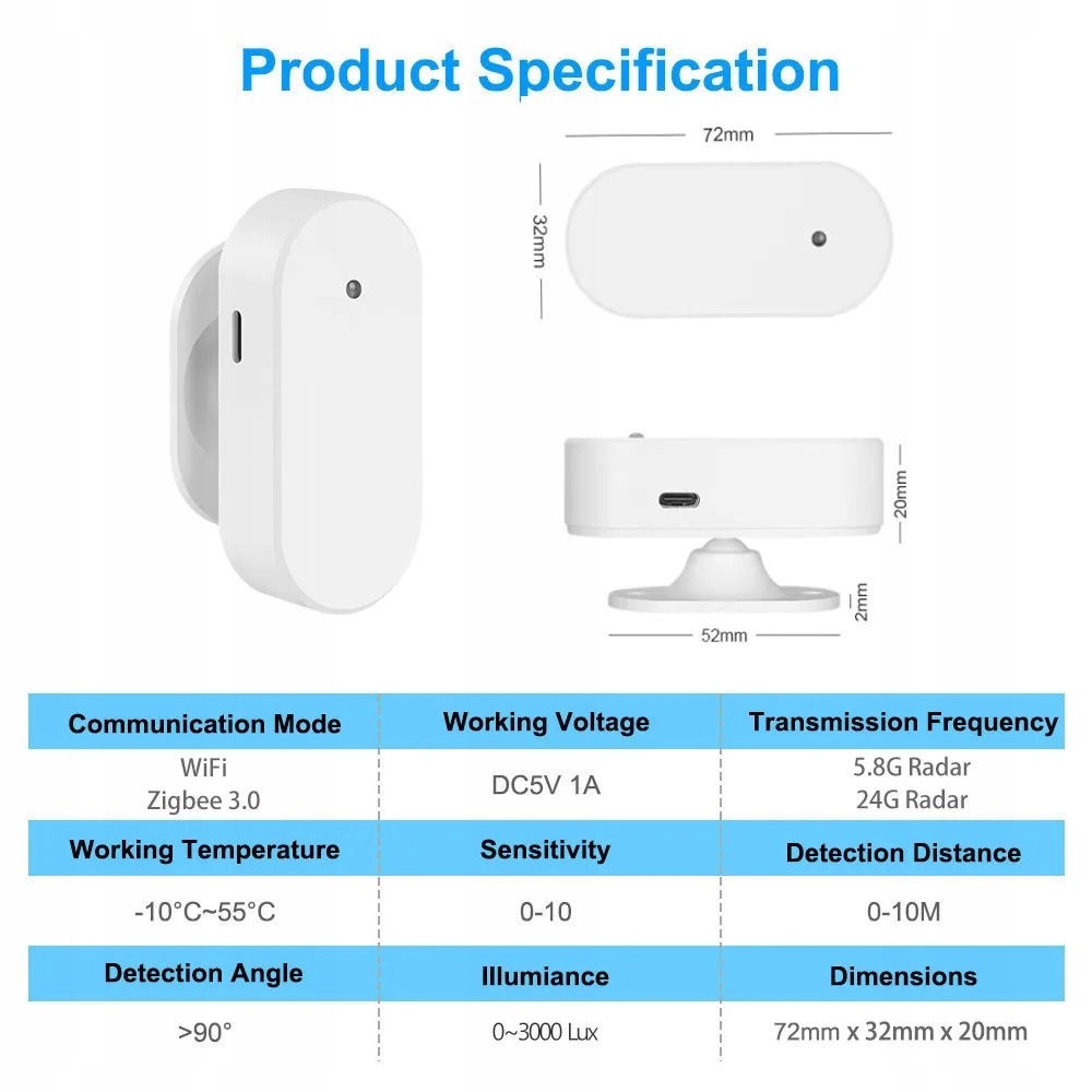 - is characterized by the detection of human presence , human statics, man microch and detecting human movement in order to detect the presence or lack of people in the area, even in order to detect the static state Персонал, завдяки функції виявлення радарів MMWAVE.