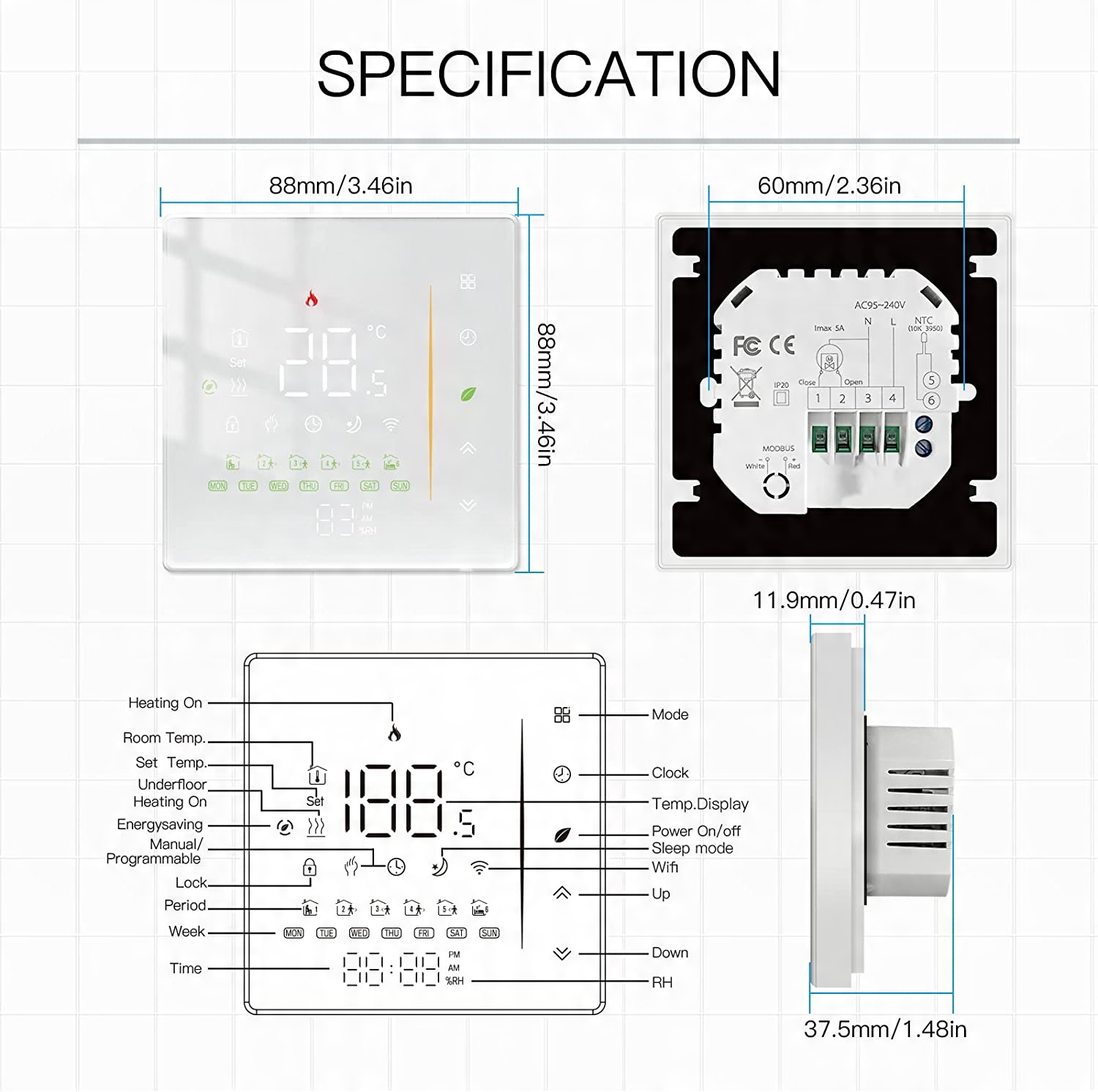 Безглуздий та танкерний тактне управління: Дивовижний новий, м'який до сенсорного дизайну з дією 2,5D дуги на краю об'єктива та кольорового світлодіодного дисплея, він виглядає як прекрасний пейзаж, а прихована сенсорна кнопка значно спрощує інтерфейс користувача. Ультра вбудована вбудована панель ідеально підходить до всіх типів стін, зі стандартними 86 -мм квадратними касетами та 60 мм європейських касет для задоволення всіх середовищ встановлення; Точність ± 1 ℃ підтримує температуру на встановленому рівні. 4 Оновлена новинка щодо батьківської блокади, мертвої температурної зони. та функціональність вибору датчика в додатку.