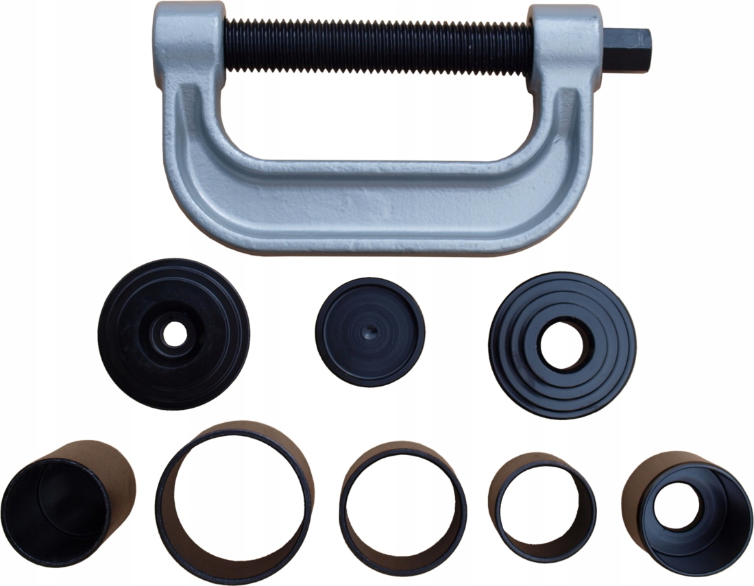 Набір призначений для монтажу та демонтажу підшипників поворотних кулаків і втулок підвіски. У комплект входить шнековий прес і перехідники. Все в елегантній валізі.